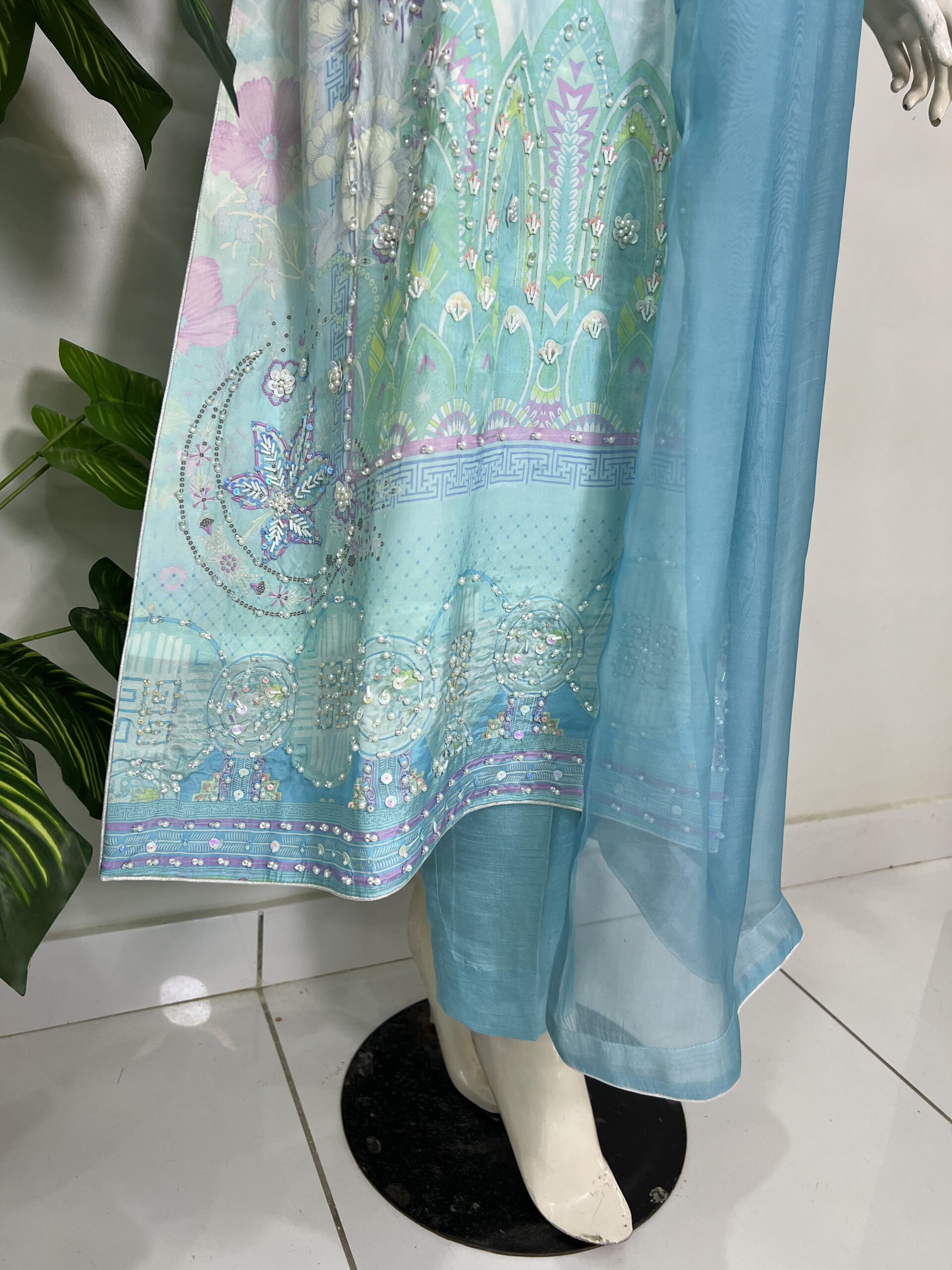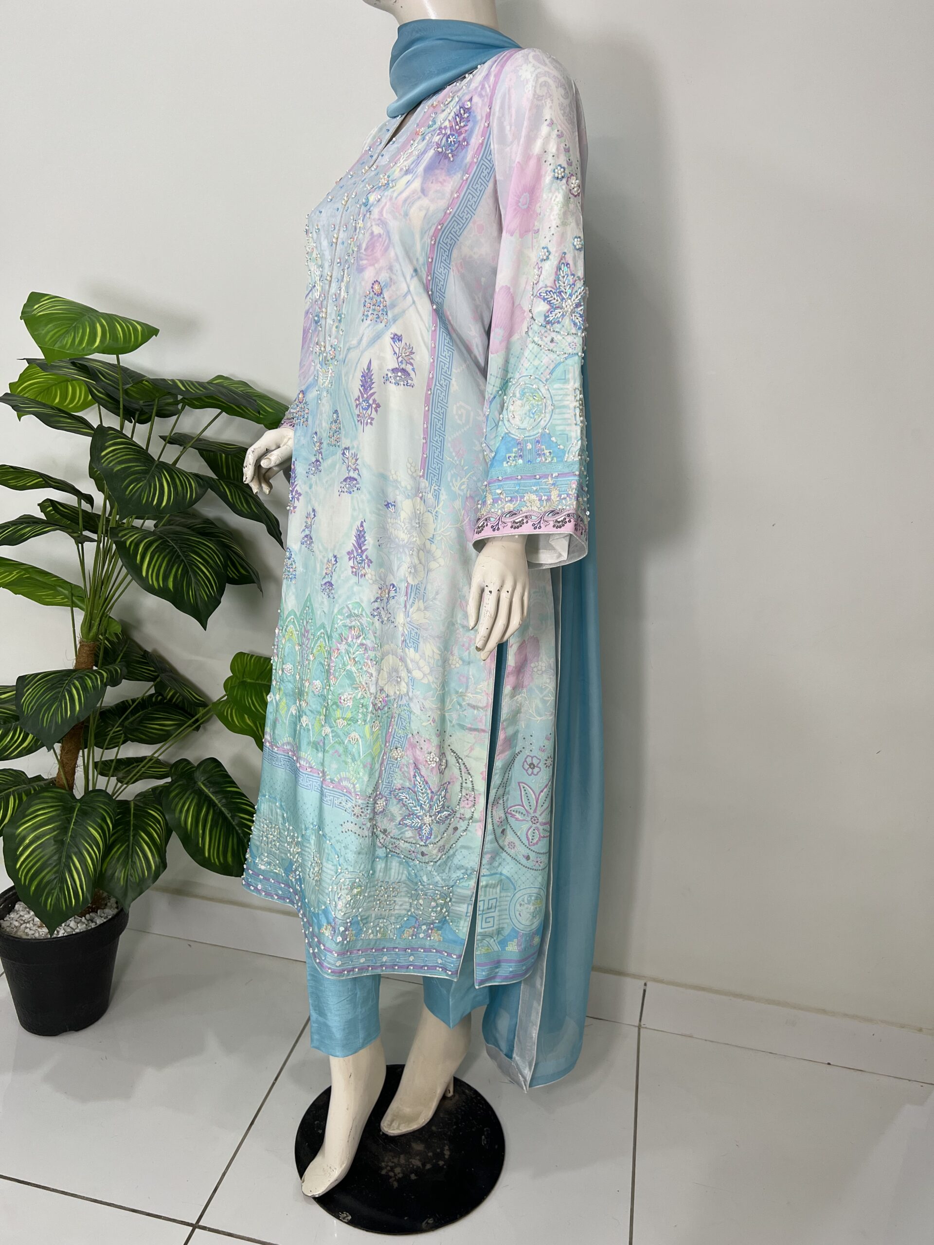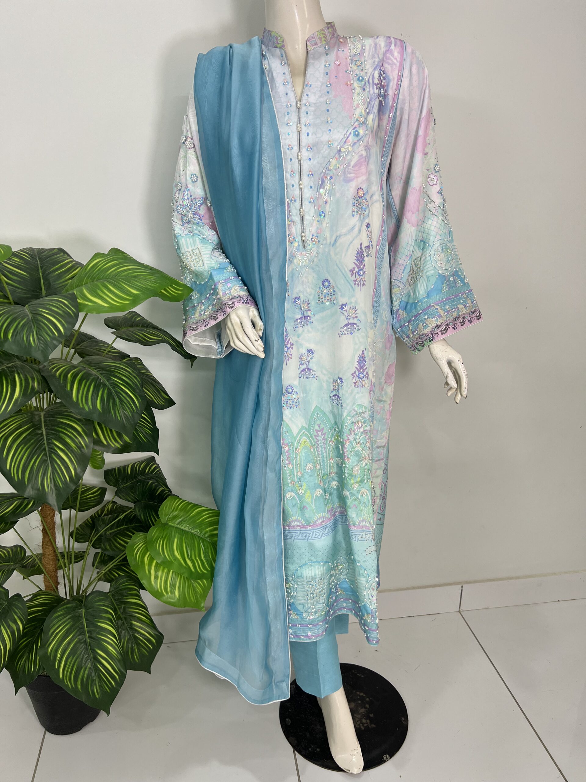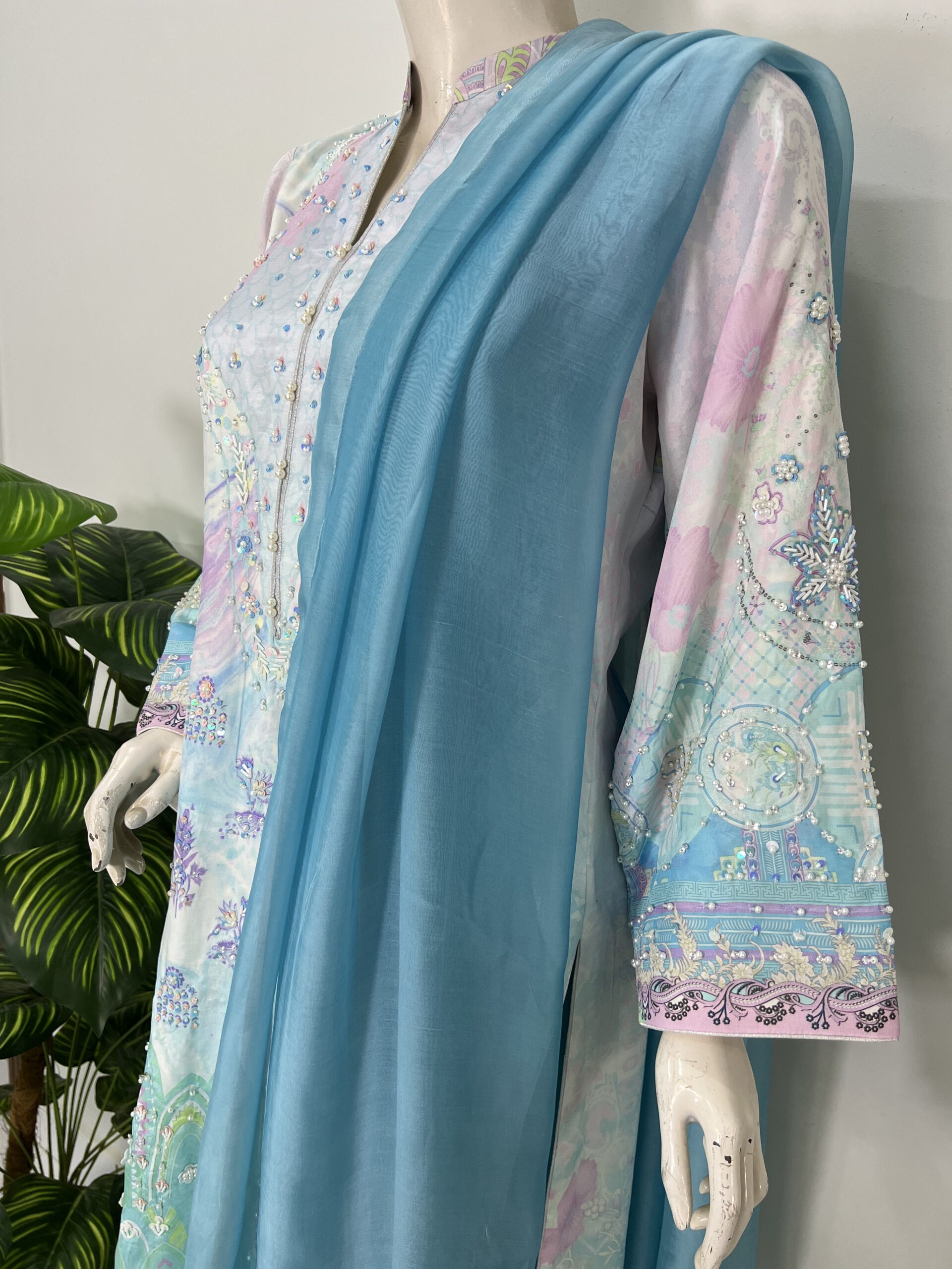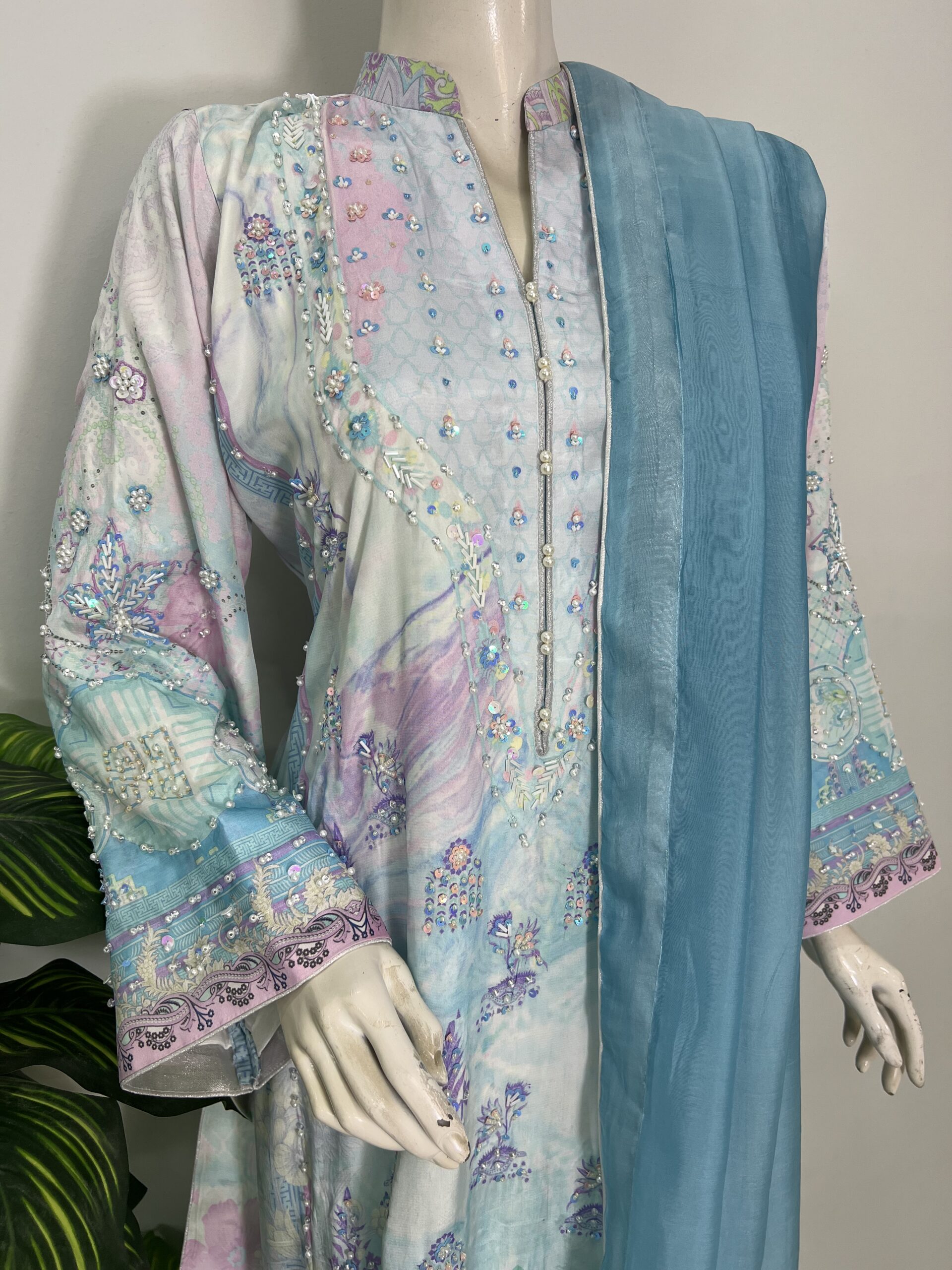 A sophisticated printed silk shirt exquisitely adorned with handwork, featuring delicate sequins, crystals, and Swarovski accents for a sparkling, opulent finish. The ensemble is paired with a silk organza dupatta, elegantly finished with silver piping on all four sides, adding a refined and graceful touch. Completing the look are matching trousers, designed to create a harmonious and regal silhouette.