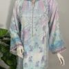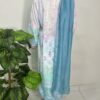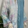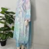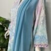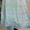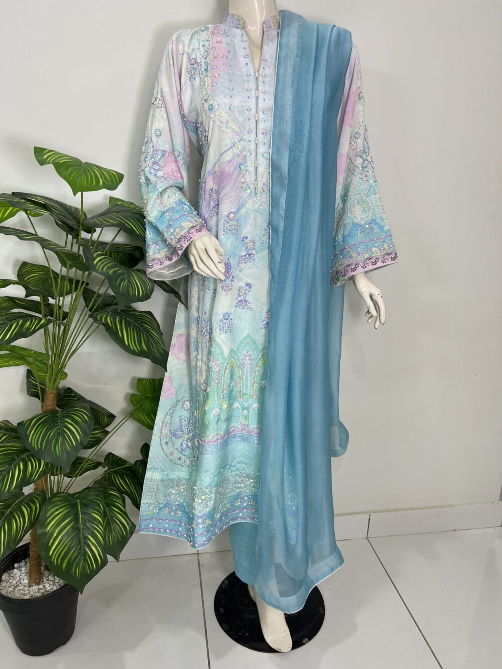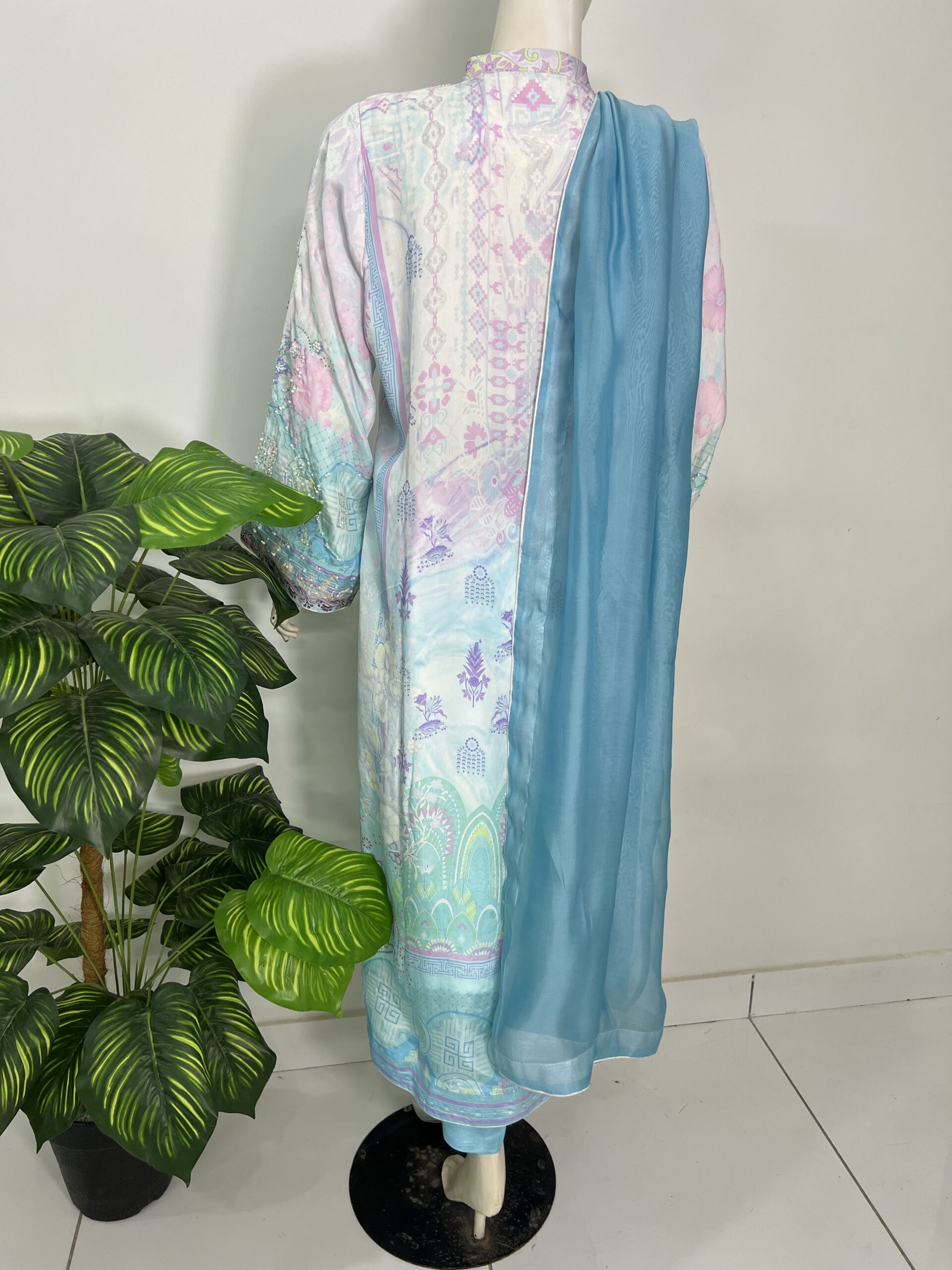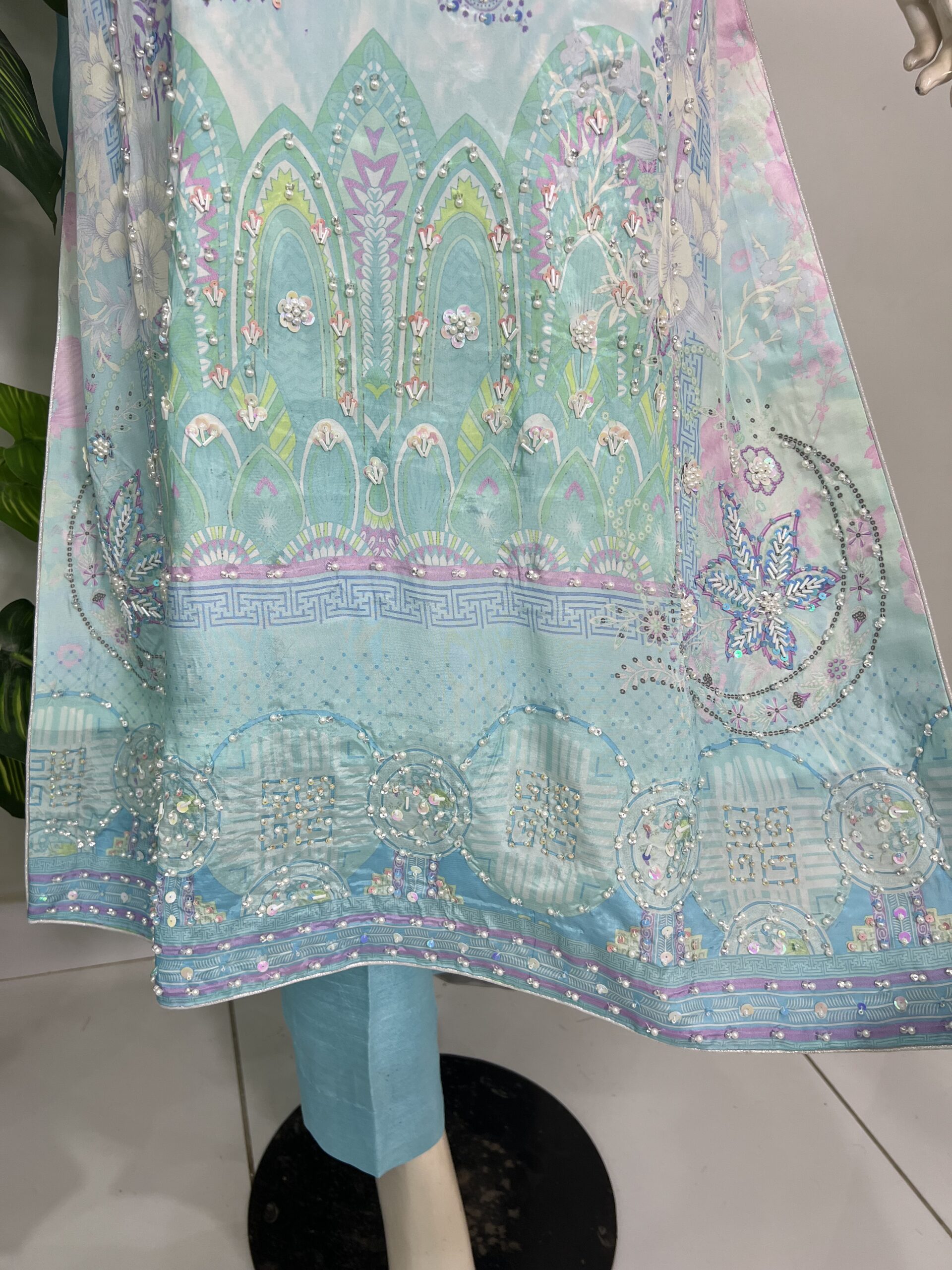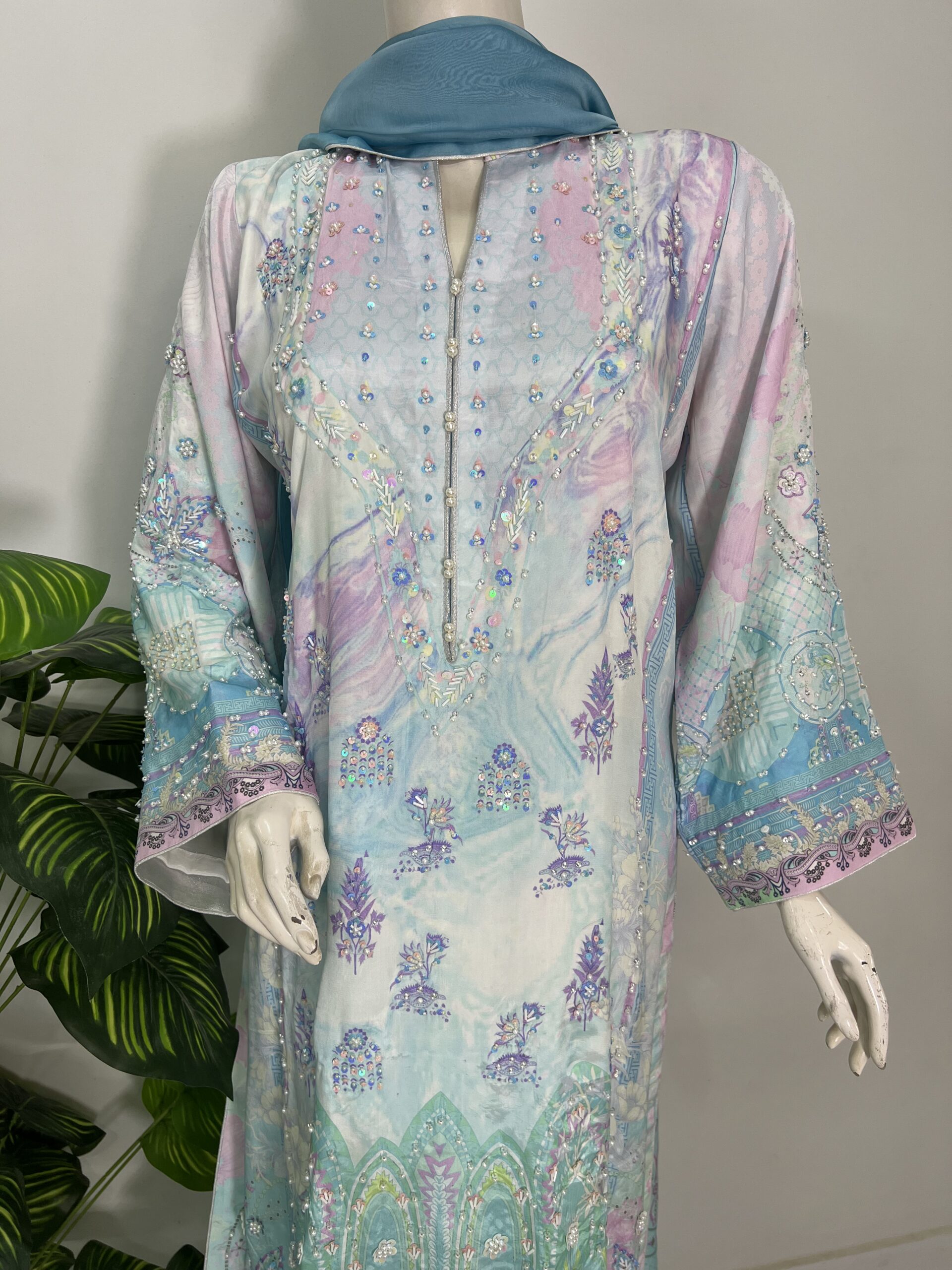 A sophisticated printed silk shirt exquisitely adorned with handwork, featuring delicate sequins, crystals, and Swarovski accents for a sparkling, opulent finish. The ensemble is paired with a silk organza dupatta, elegantly finished with silver piping on all four sides, adding a refined and graceful touch. Completing the look are matching trousers, designed to create a harmonious and regal silhouette.