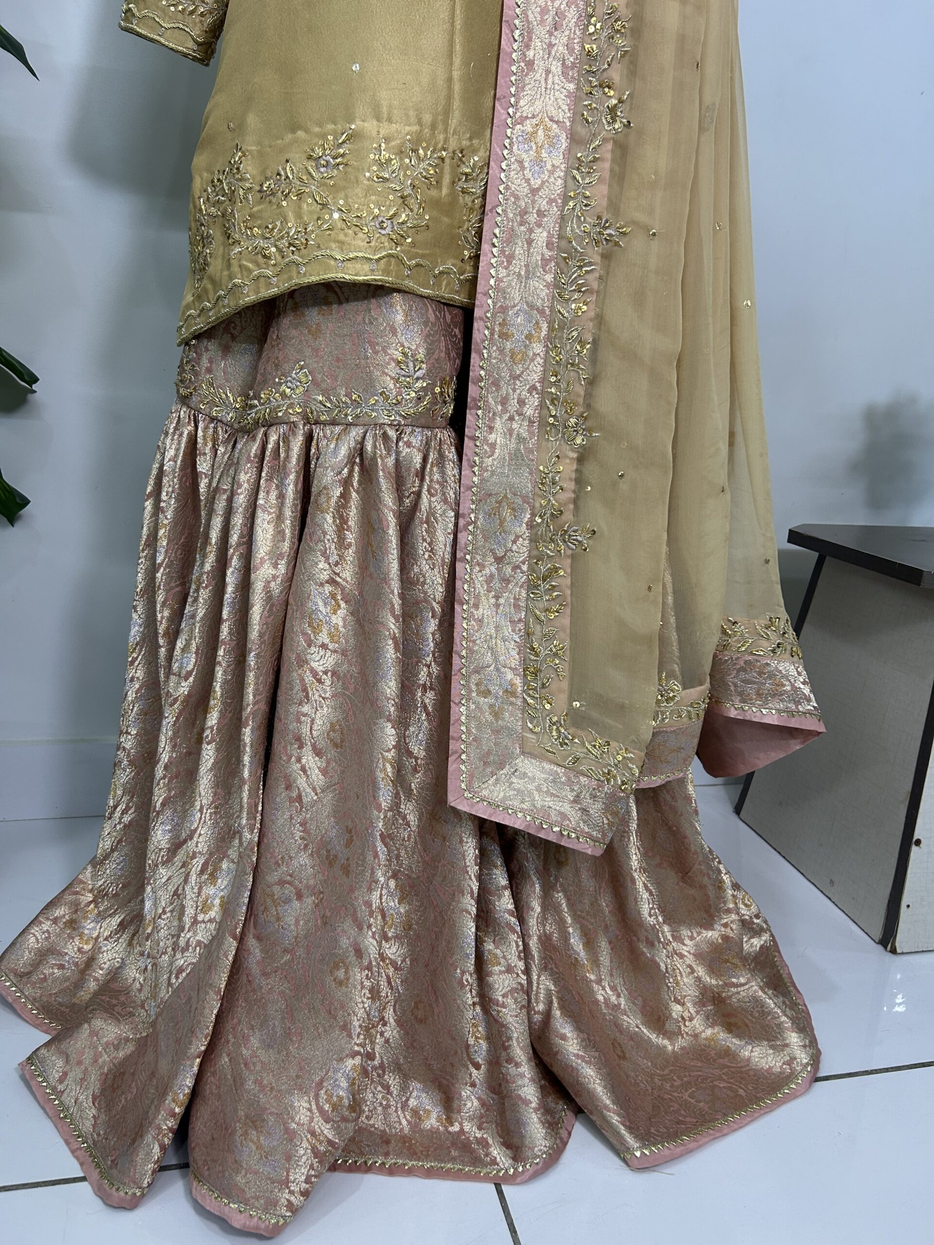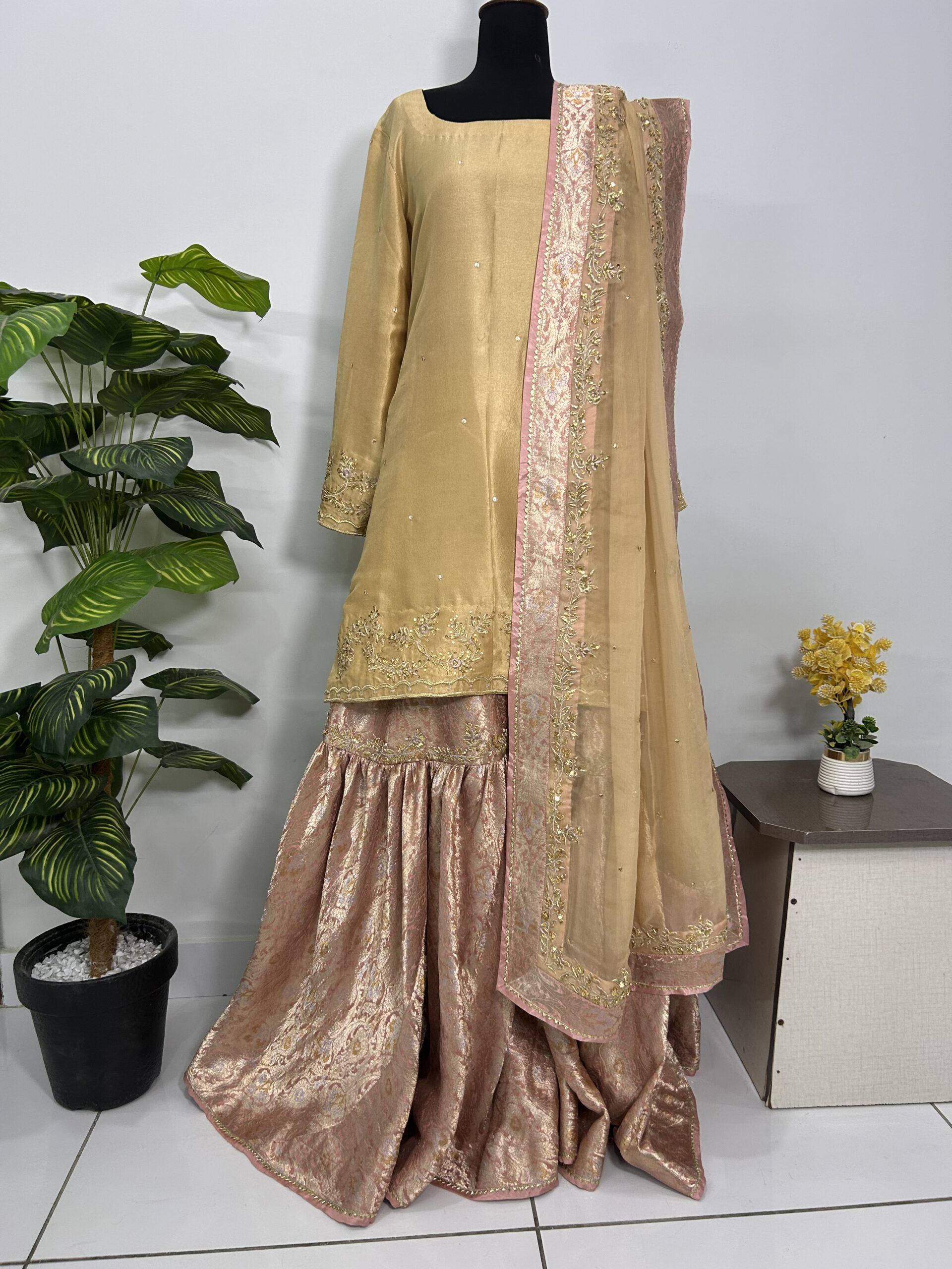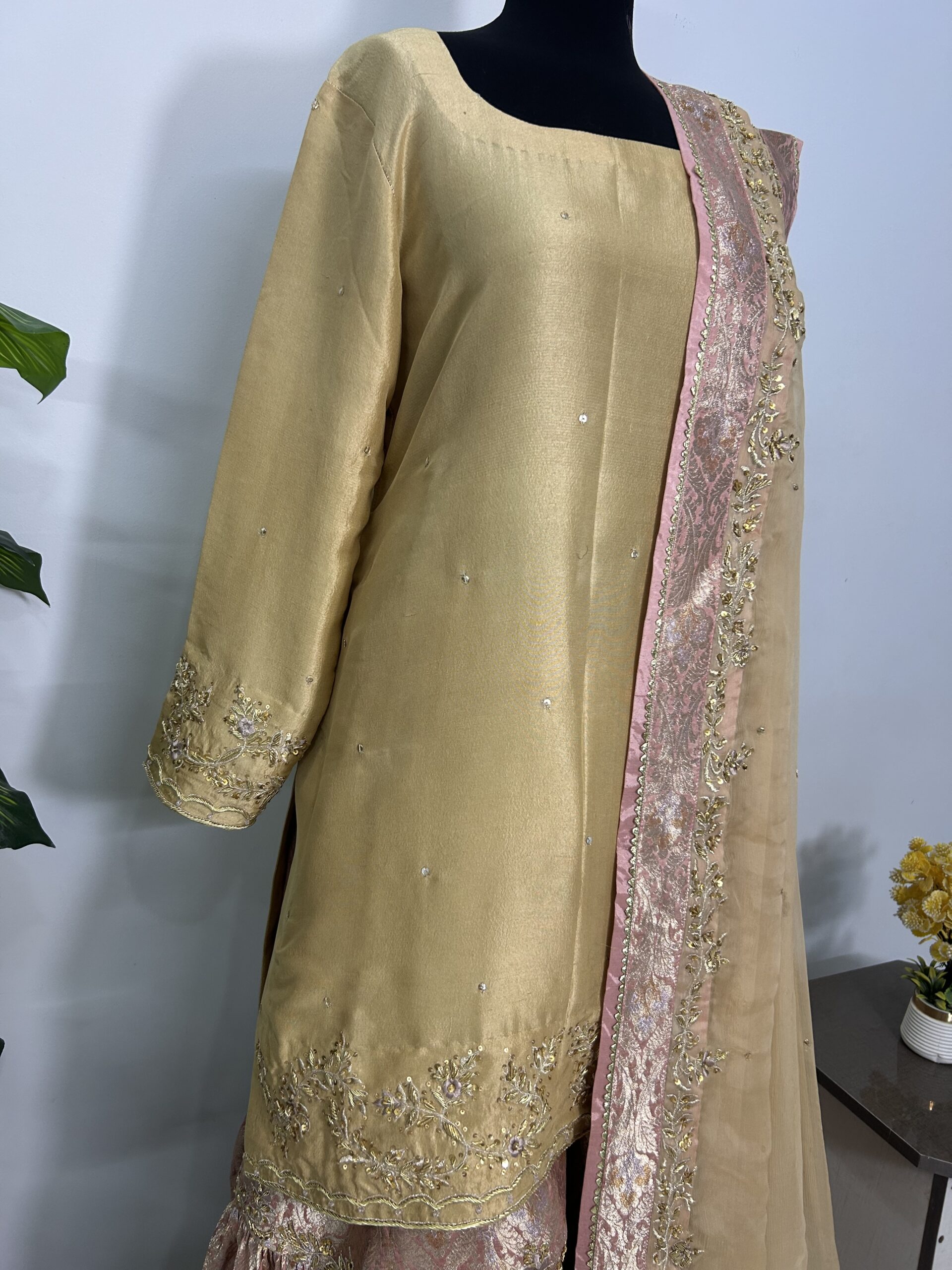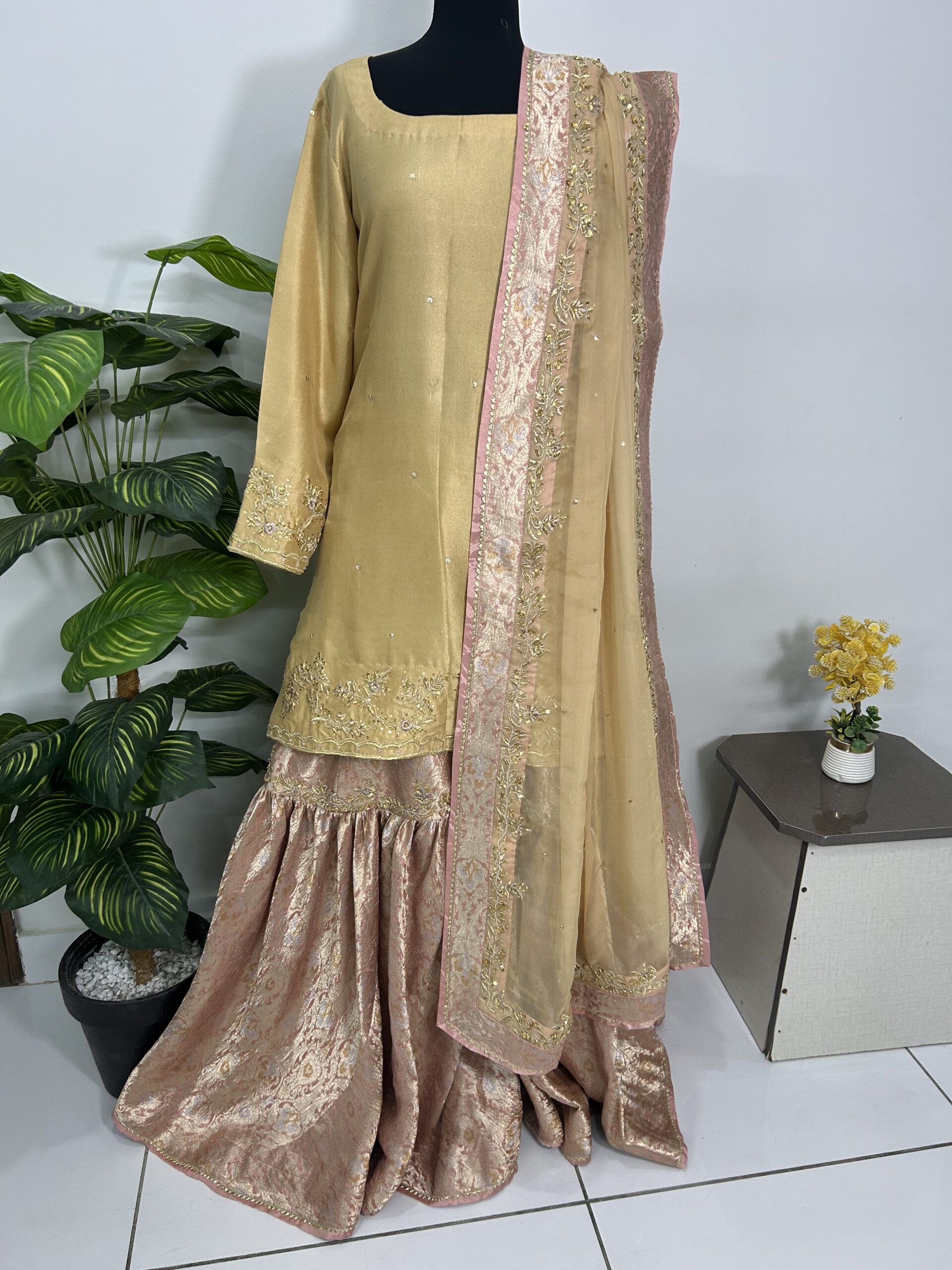 Shirt made on pure raw silk canvas, with the daman and sleeves beautifully adorned with embroidery and delicate hand embellishment. It comes with a matching pure chiffon dupatta, embroidered and embellished on all four sides, finished with gota and jamawar detailing. Paired with a pure jamawar gharara featuring subtle handwork and refined gota finishing, adding the perfect traditional flair. .This ensemble exudes old-school charm and regal sophistication, making it an ideal choice for weddings, festive occasions, or cultural celebrations.