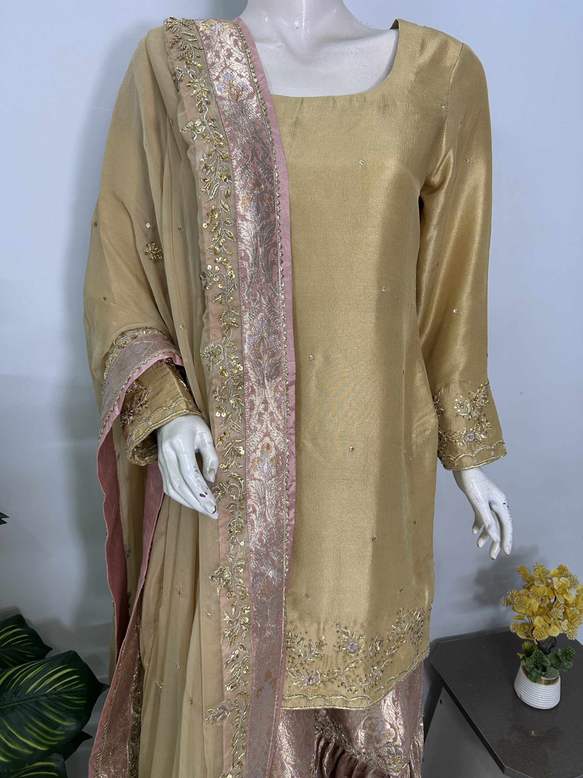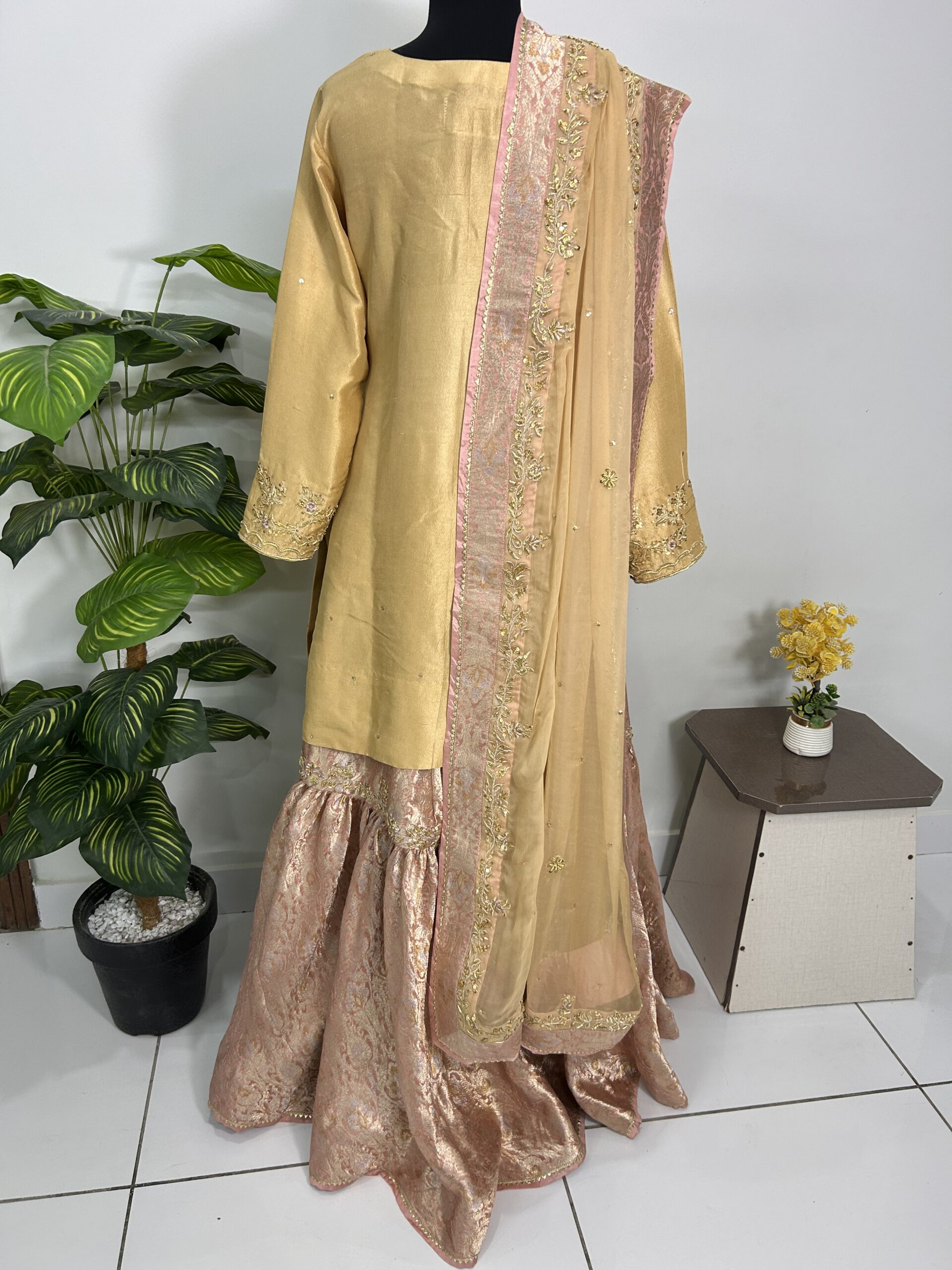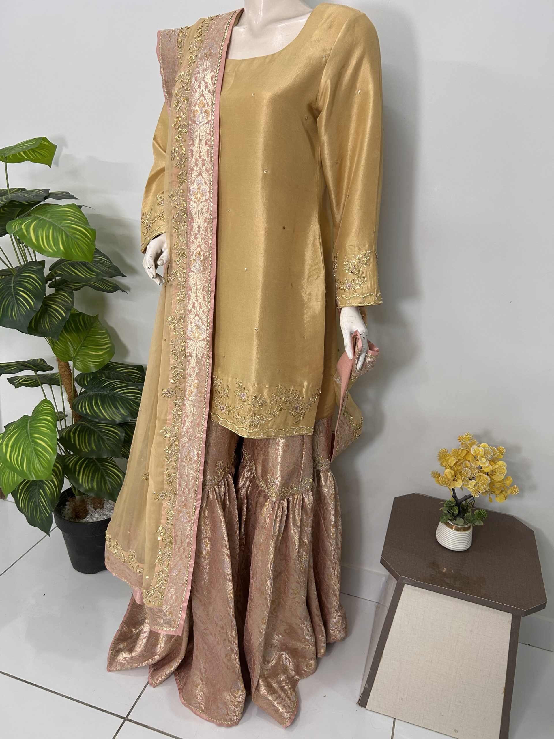 Shirt made on pure raw silk canvas, with the daman and sleeves beautifully adorned with embroidery and delicate hand embellishment. It comes with a matching pure chiffon dupatta, embroidered and embellished on all four sides, finished with gota and jamawar detailing. Paired with a pure jamawar gharara featuring subtle handwork and refined gota finishing, adding the perfect traditional flair. .This ensemble exudes old-school charm and regal sophistication, making it an ideal choice for weddings, festive occasions, or cultural celebrations.