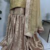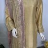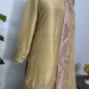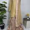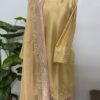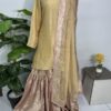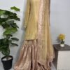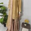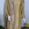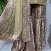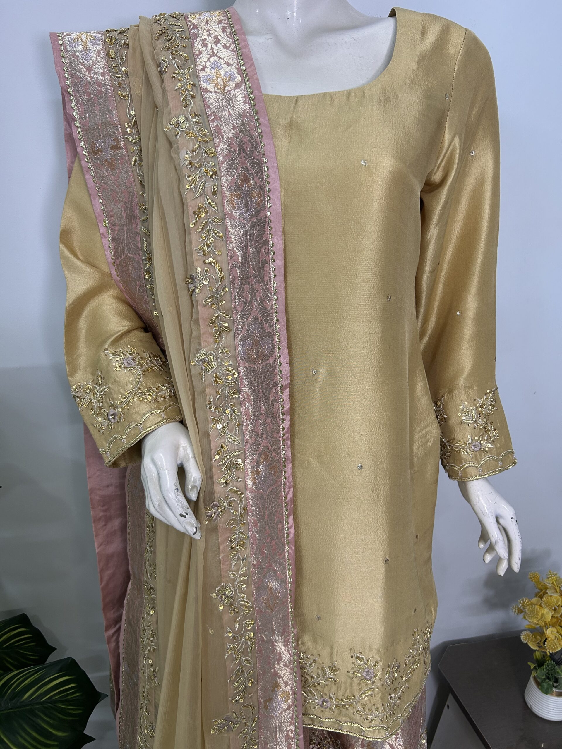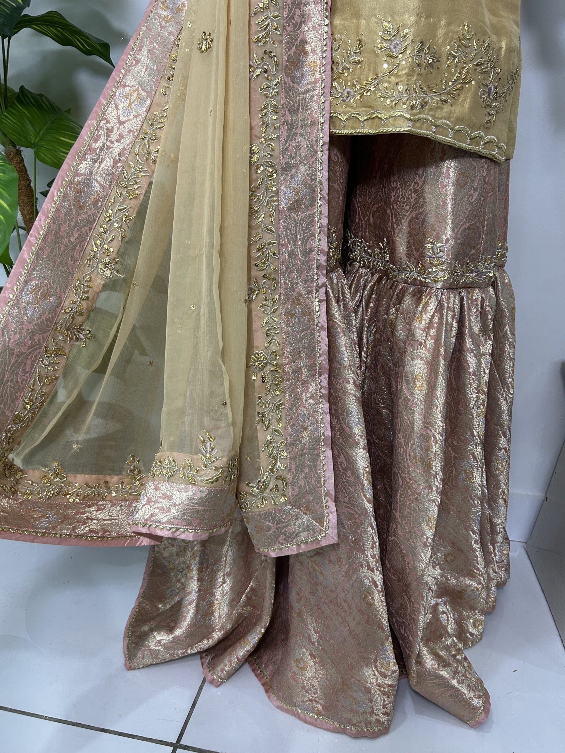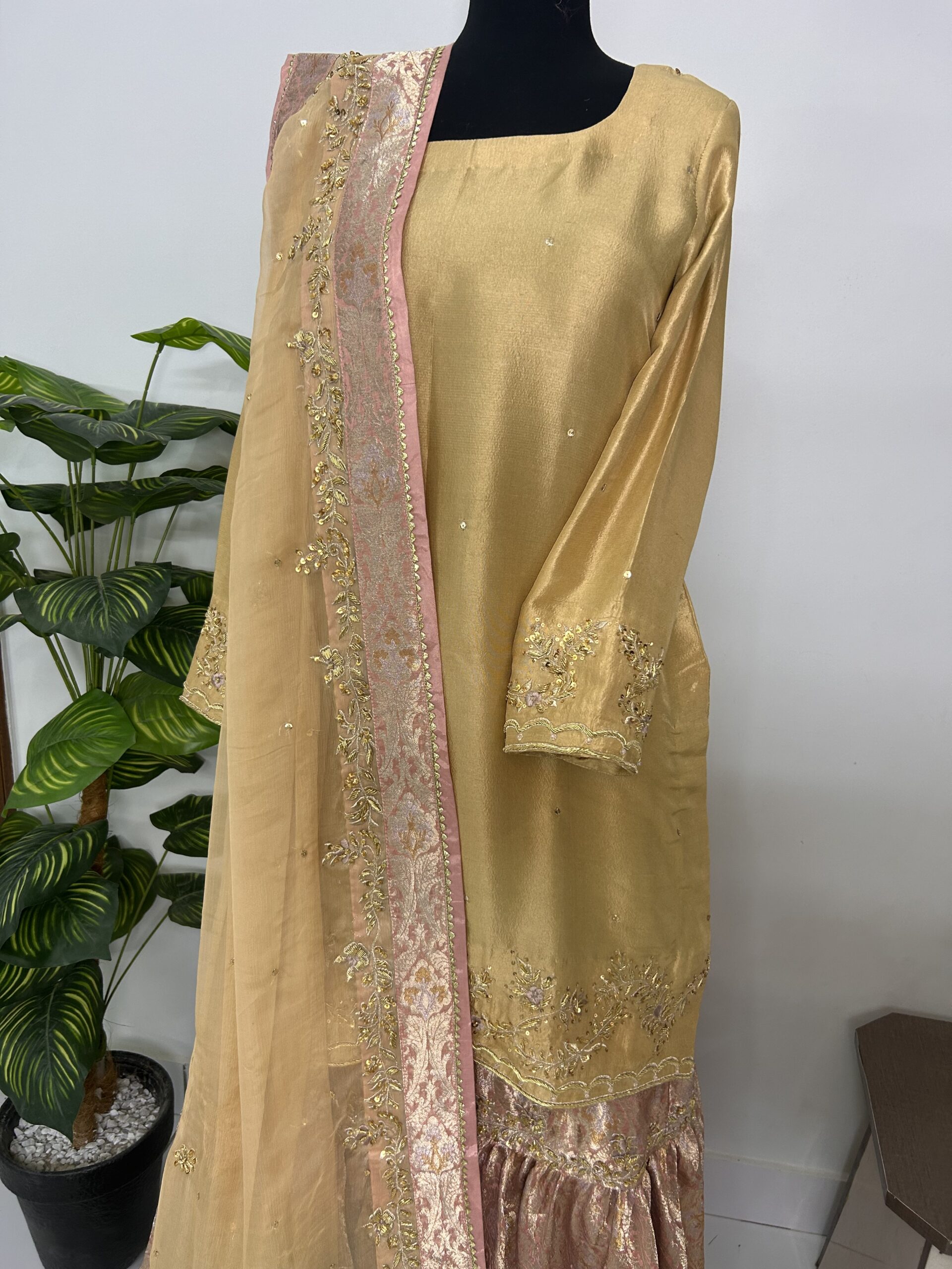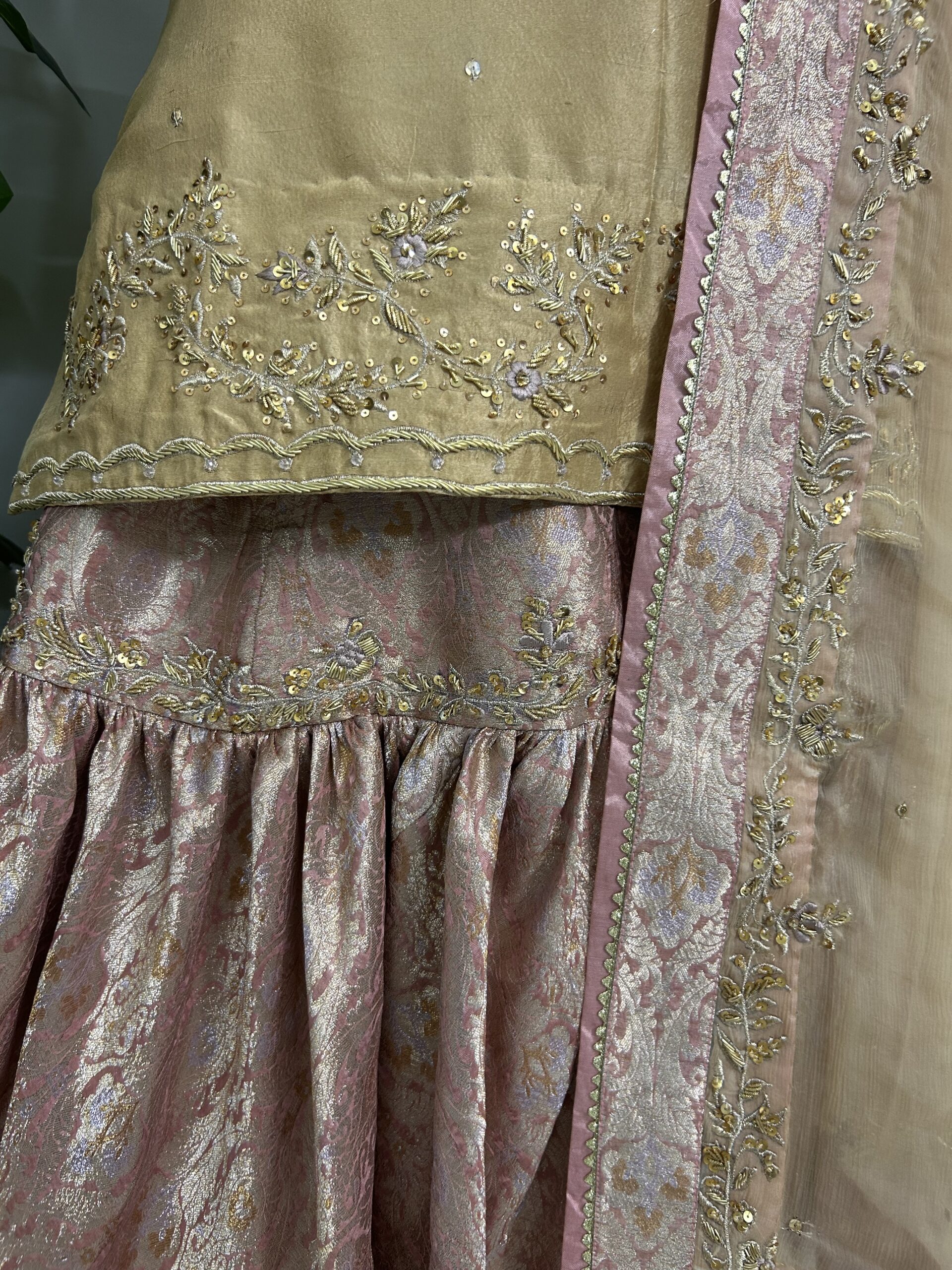 Shirt made on pure raw silk canvas, with the daman and sleeves beautifully adorned with embroidery and delicate hand embellishment. It comes with a matching pure chiffon dupatta, embroidered and embellished on all four sides, finished with gota and jamawar detailing. Paired with a pure jamawar gharara featuring subtle handwork and refined gota finishing, adding the perfect traditional flair. .This ensemble exudes old-school charm and regal sophistication, making it an ideal choice for weddings, festive occasions, or cultural celebrations.