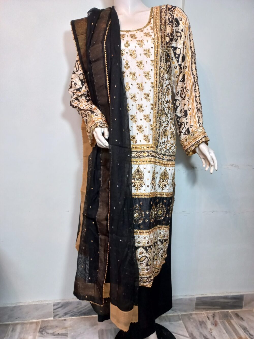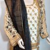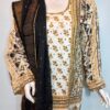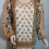 A vibrant printed shirt in lively, festive hues, beautifully enhanced with intricate handwork featuring gota, cora, and dabka. Paired with matching trousers and a dupatta finished with delicate detailing on all four sides, this ensemble is designed to perfection. A joyful and elegant choice for mehndi, mayoon, or dholki events, it captures the essence of celebration with traditional charm and modern flair.