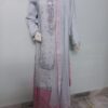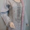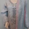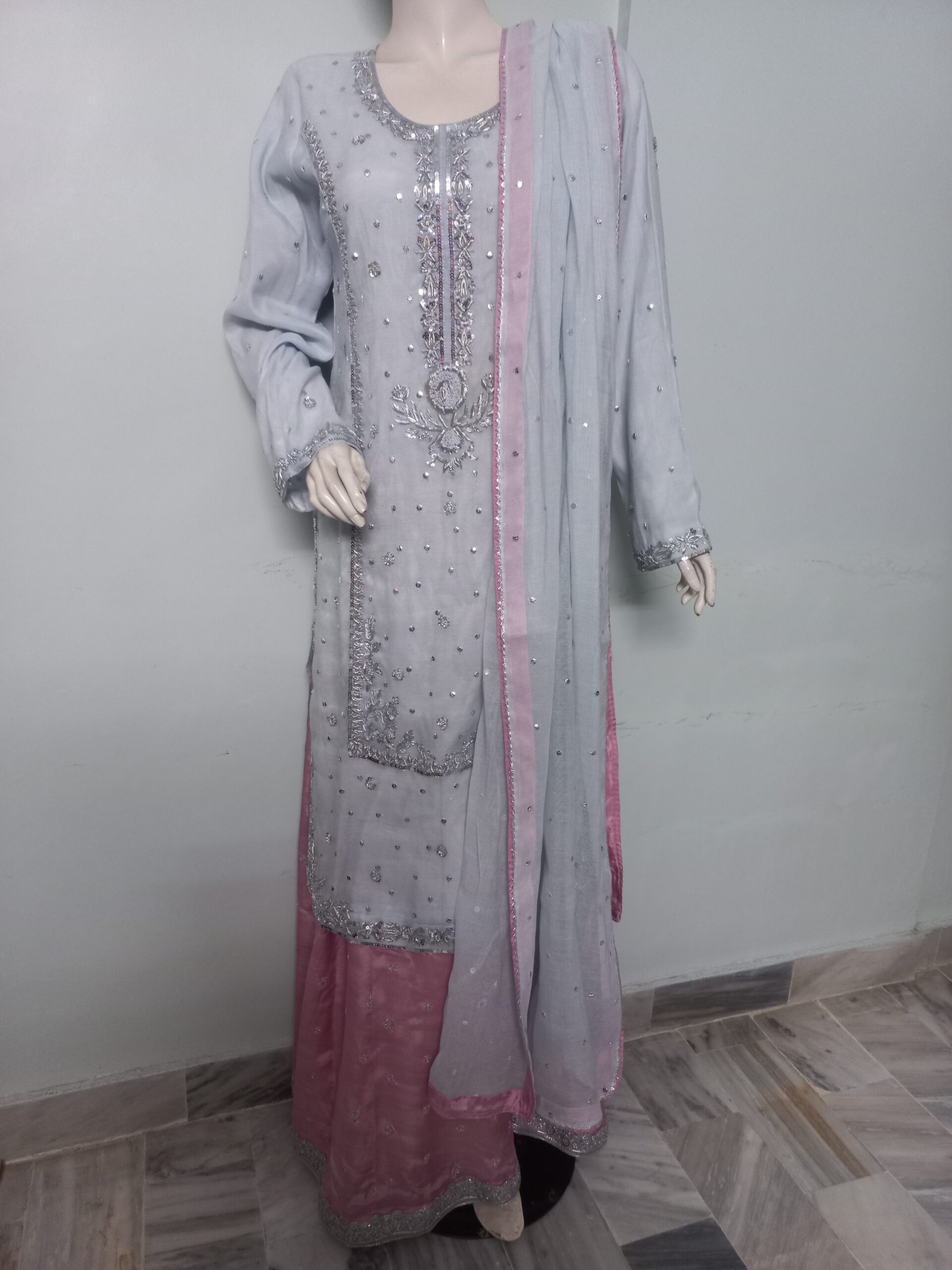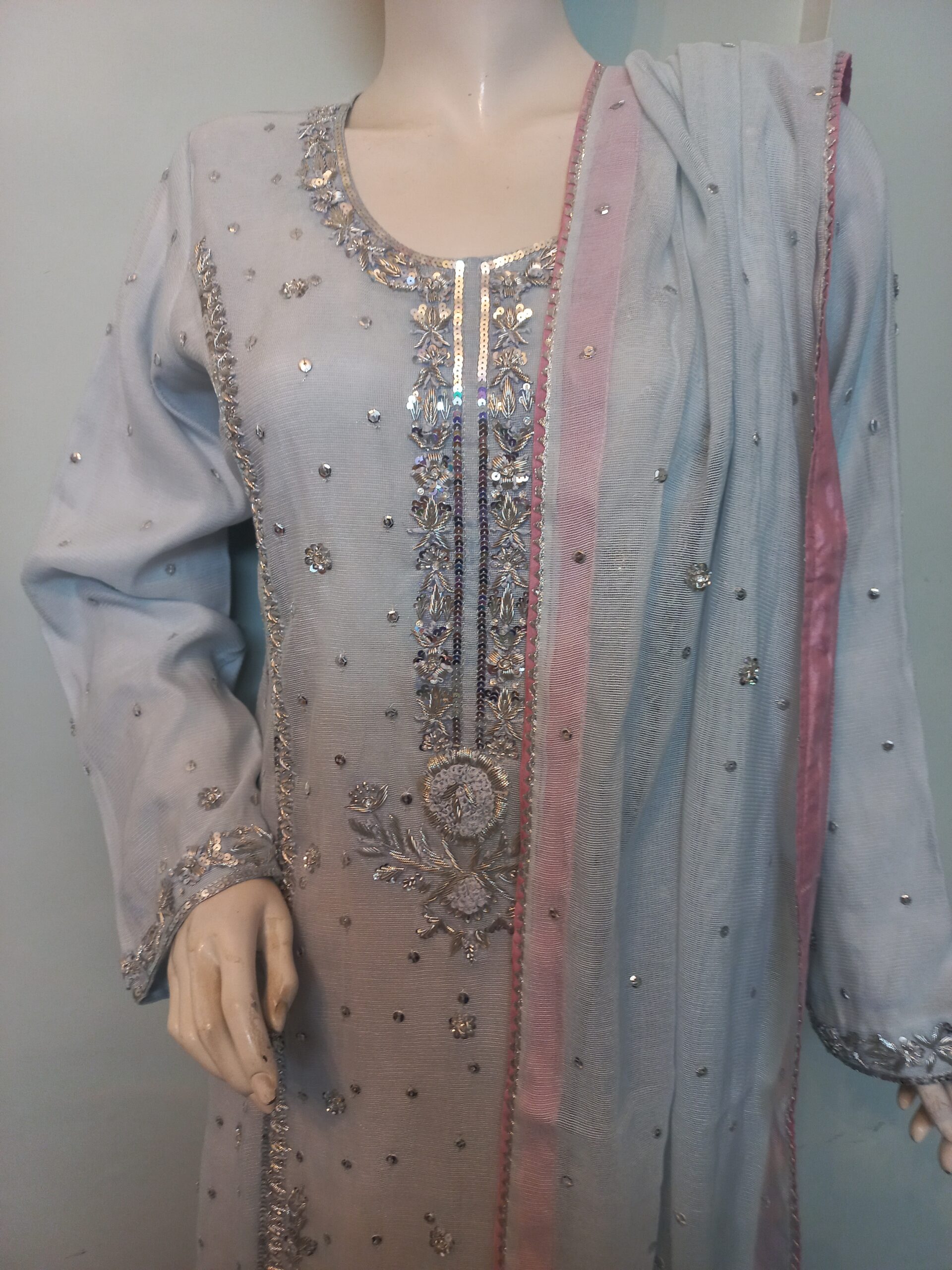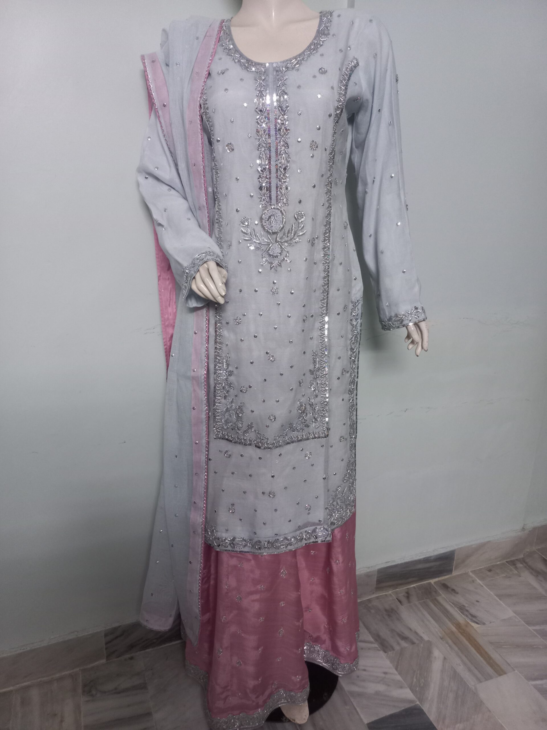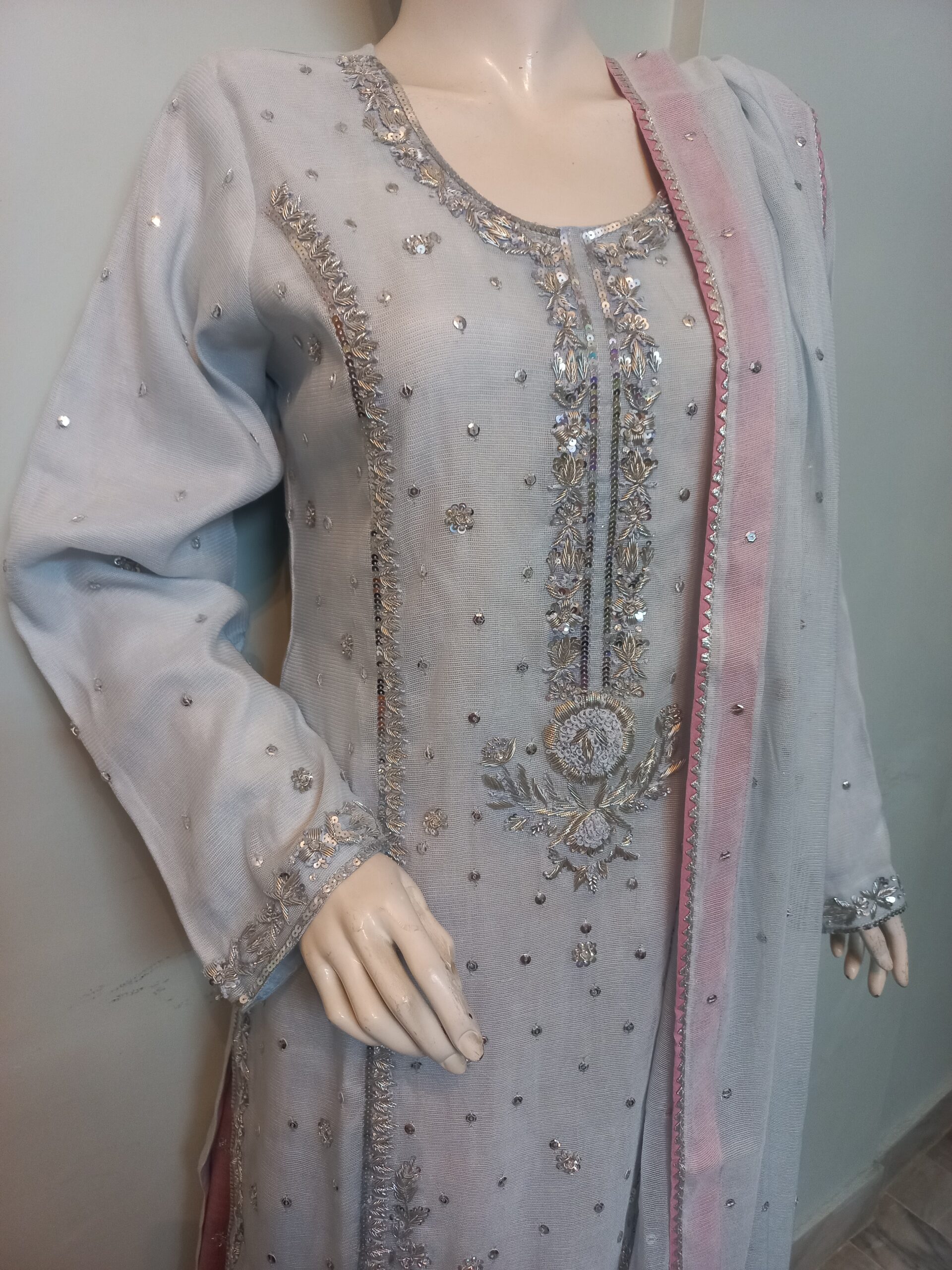 A sophisticated ensemble featuring a shirt embellished with intricate silver handwork of cora dabka and sequins. The dupatta is delicately finished with a sequin spray and gota detailing on all four sides of the border, adding a timeless shimmer. It is paired with a pale plum dhaka pajama, enhanced with embroidered small motifs and finished with elegant lace detailing on the hemline, completing the graceful look.