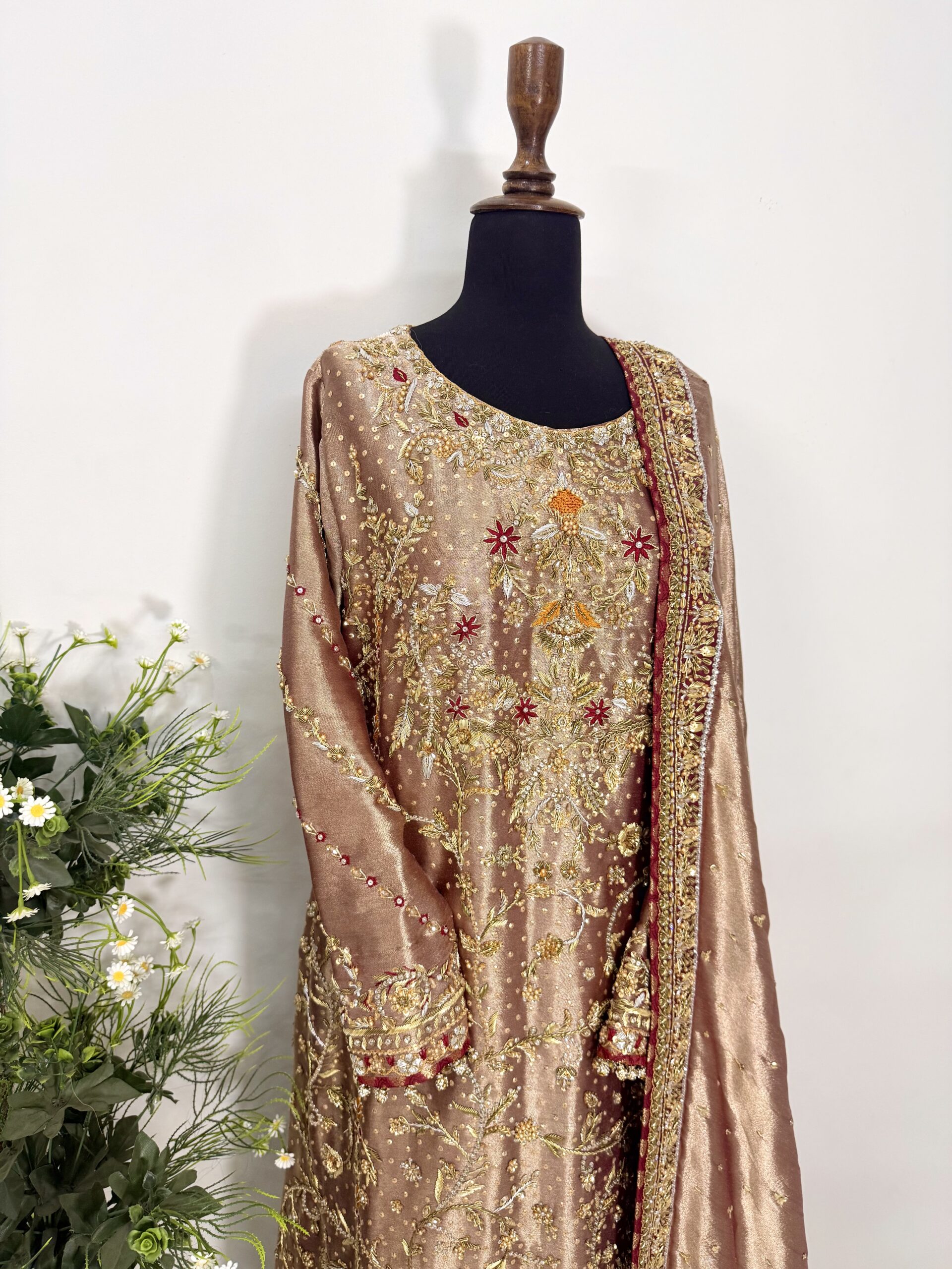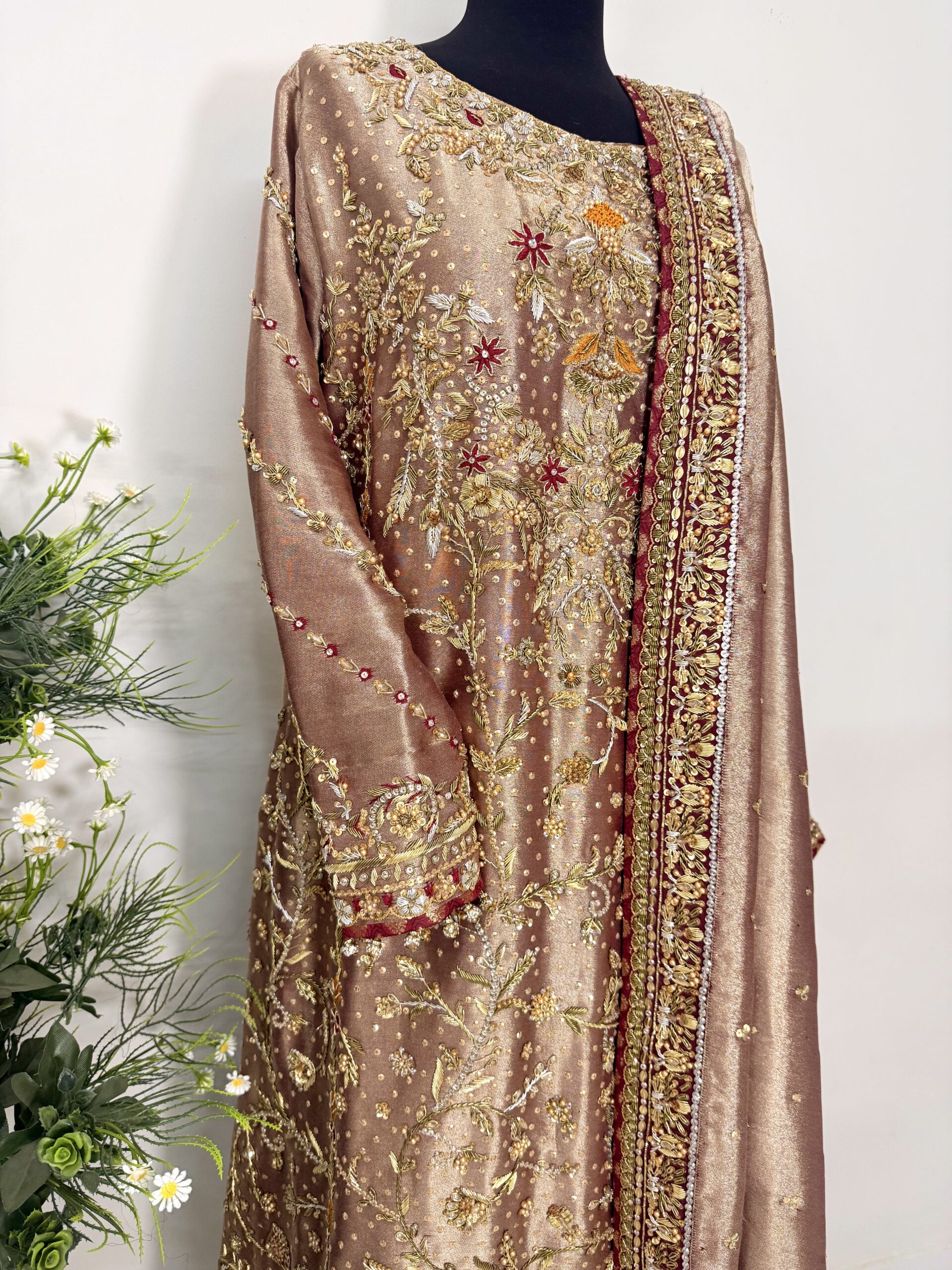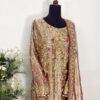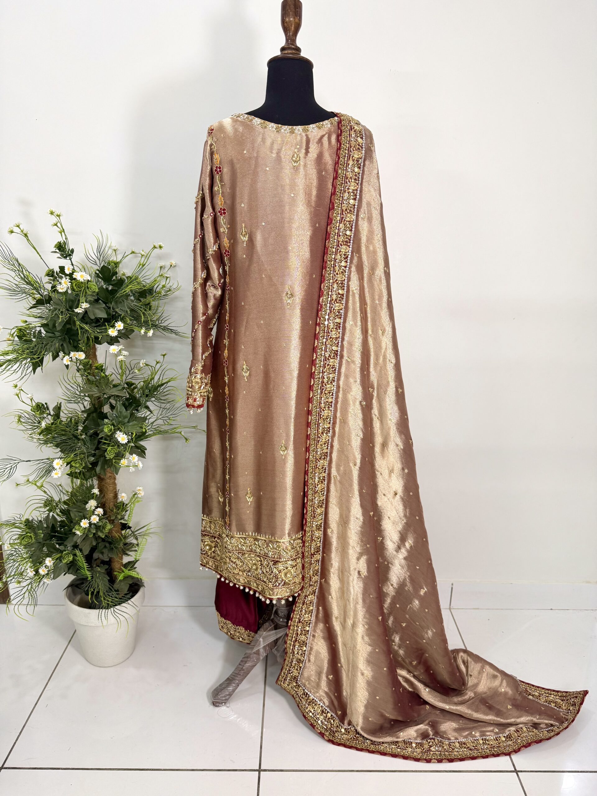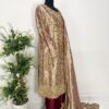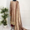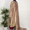 Paired with a stunning dupatta featuring a richly hand-embellished border on all four sides with refined jamawar finishing, the outfit exudes regal charm. The silk trousers are completed with an elegantly embellished border, perfectly complementing the overall ensemble and creating a harmonious, statement look.