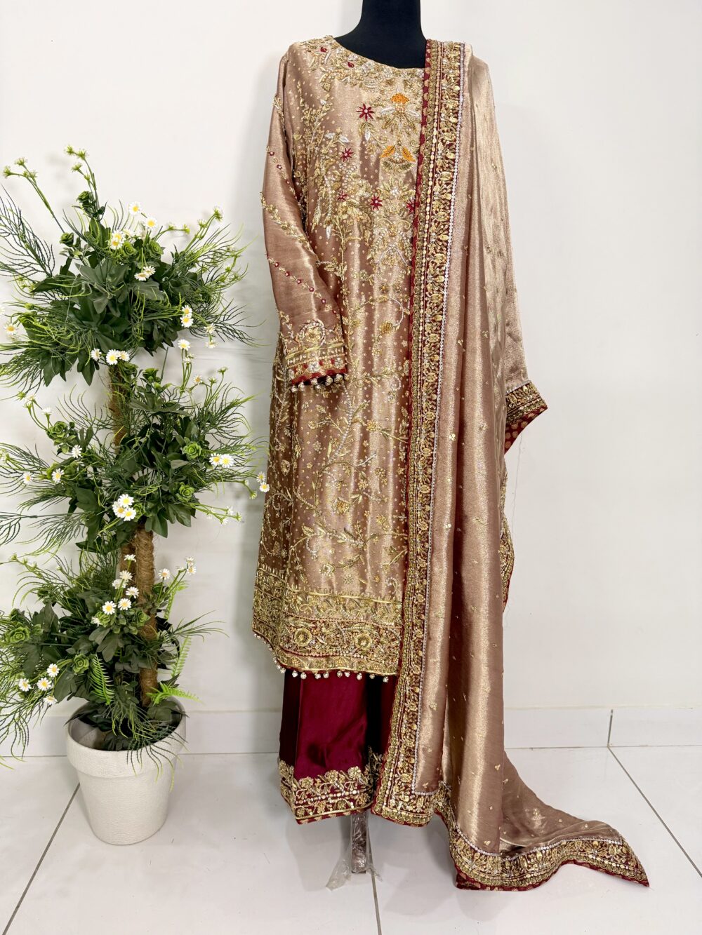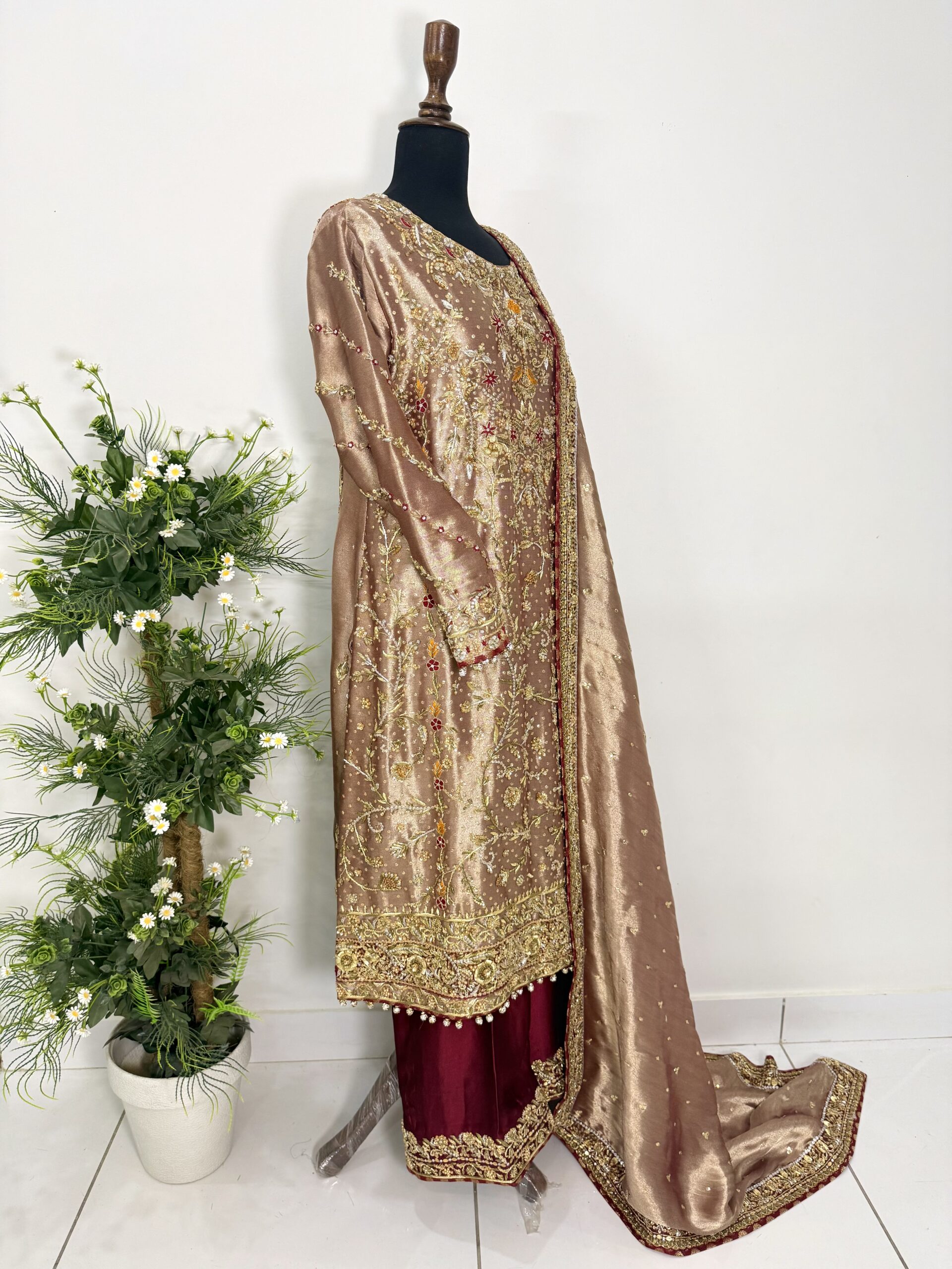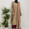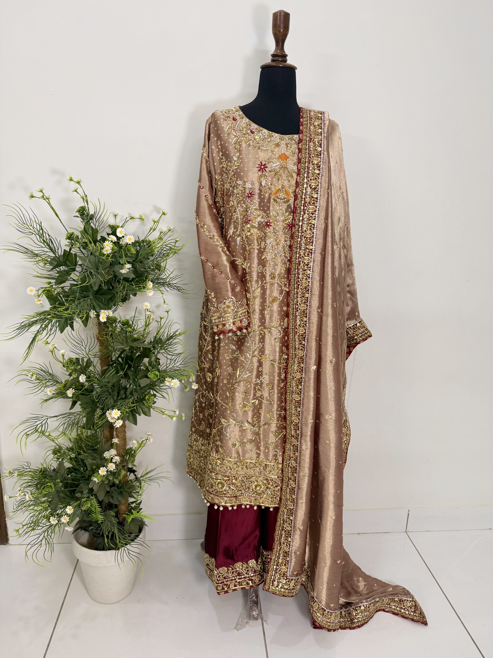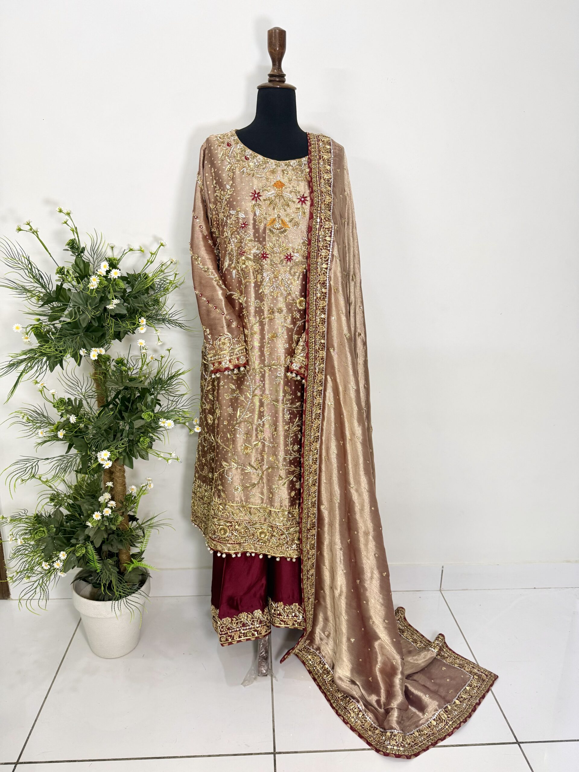 Paired with a stunning dupatta featuring a richly hand-embellished border on all four sides with refined jamawar finishing, the outfit exudes regal charm. The silk trousers are completed with an elegantly embellished border, perfectly complementing the overall ensemble and creating a harmonious, statement look.