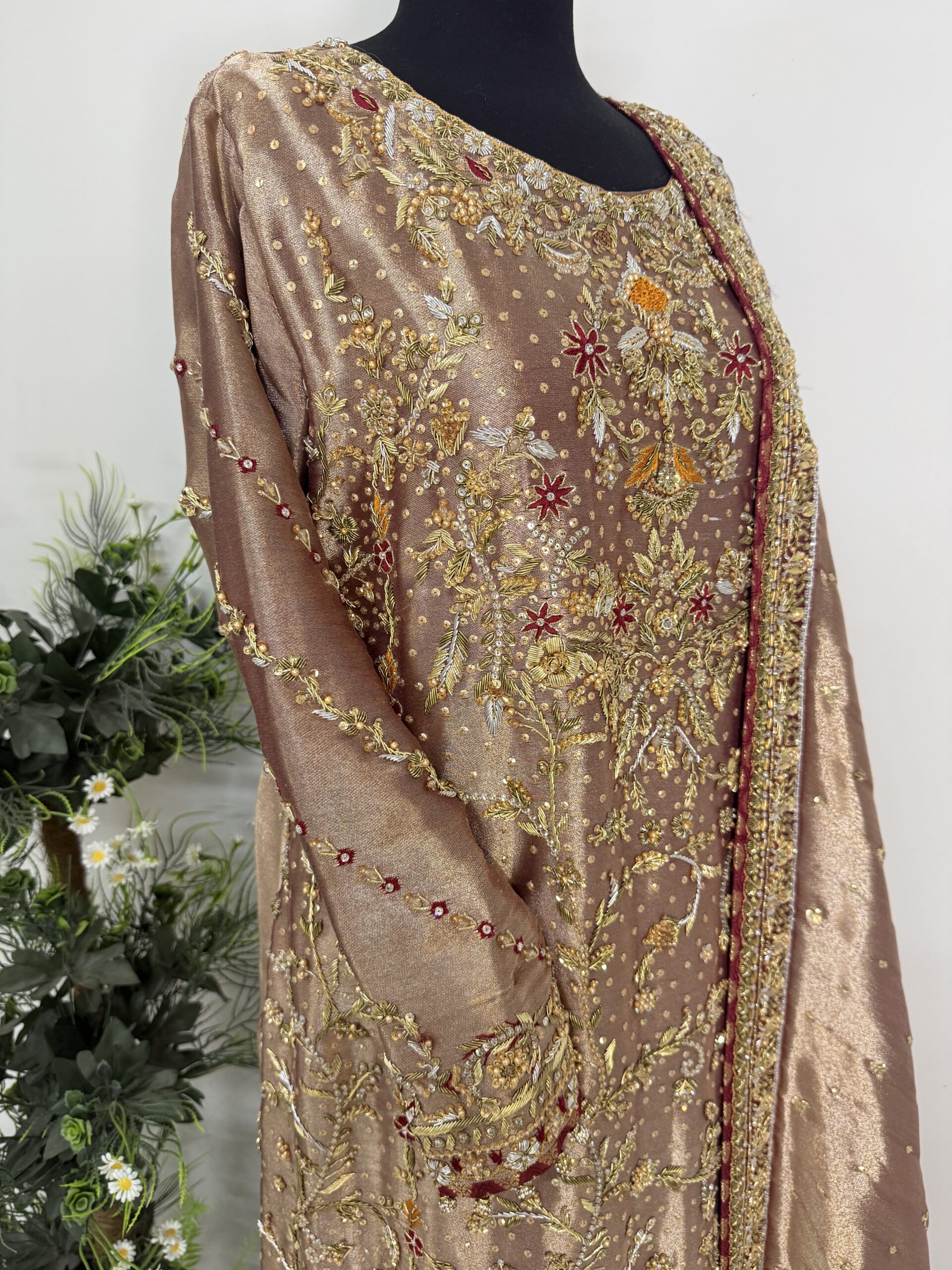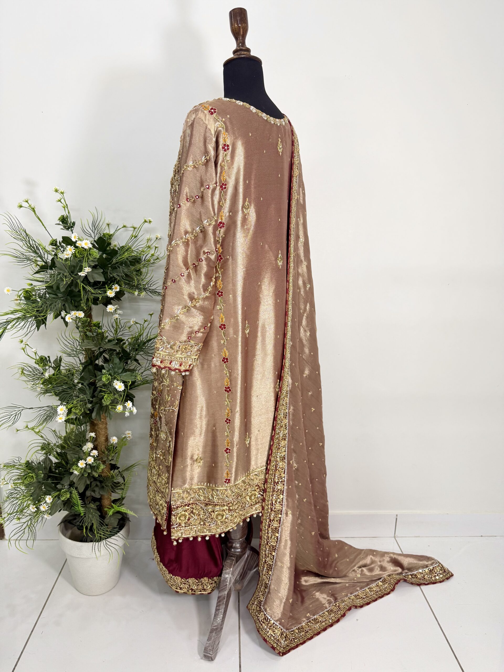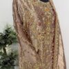 This exquisite ensemble is crafted from pure lamé silk, radiating elegance and sophistication. The shirt is lavishly adorned with intricate hand embellishments on the front, back, and sleeves, showcasing meticulous craftsmanship and timeless artistry. Tassels adorn the sleeves and daman border, adding graceful movement and a refined finishing touch to the design.
