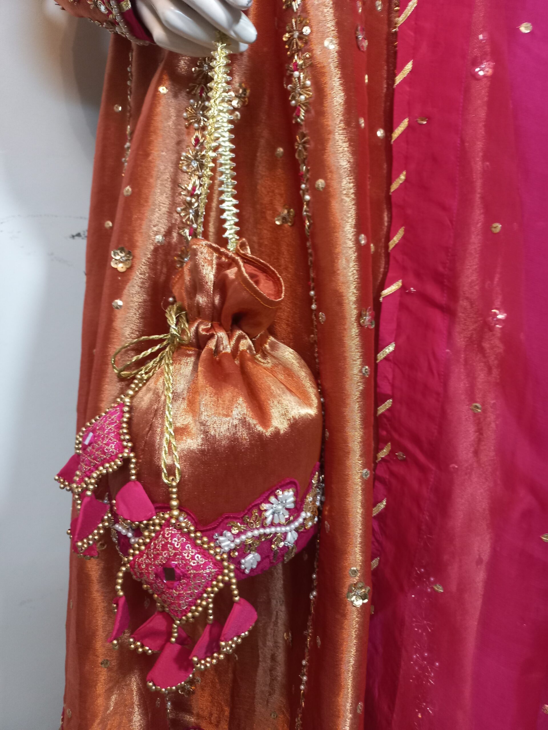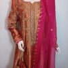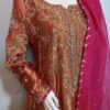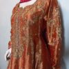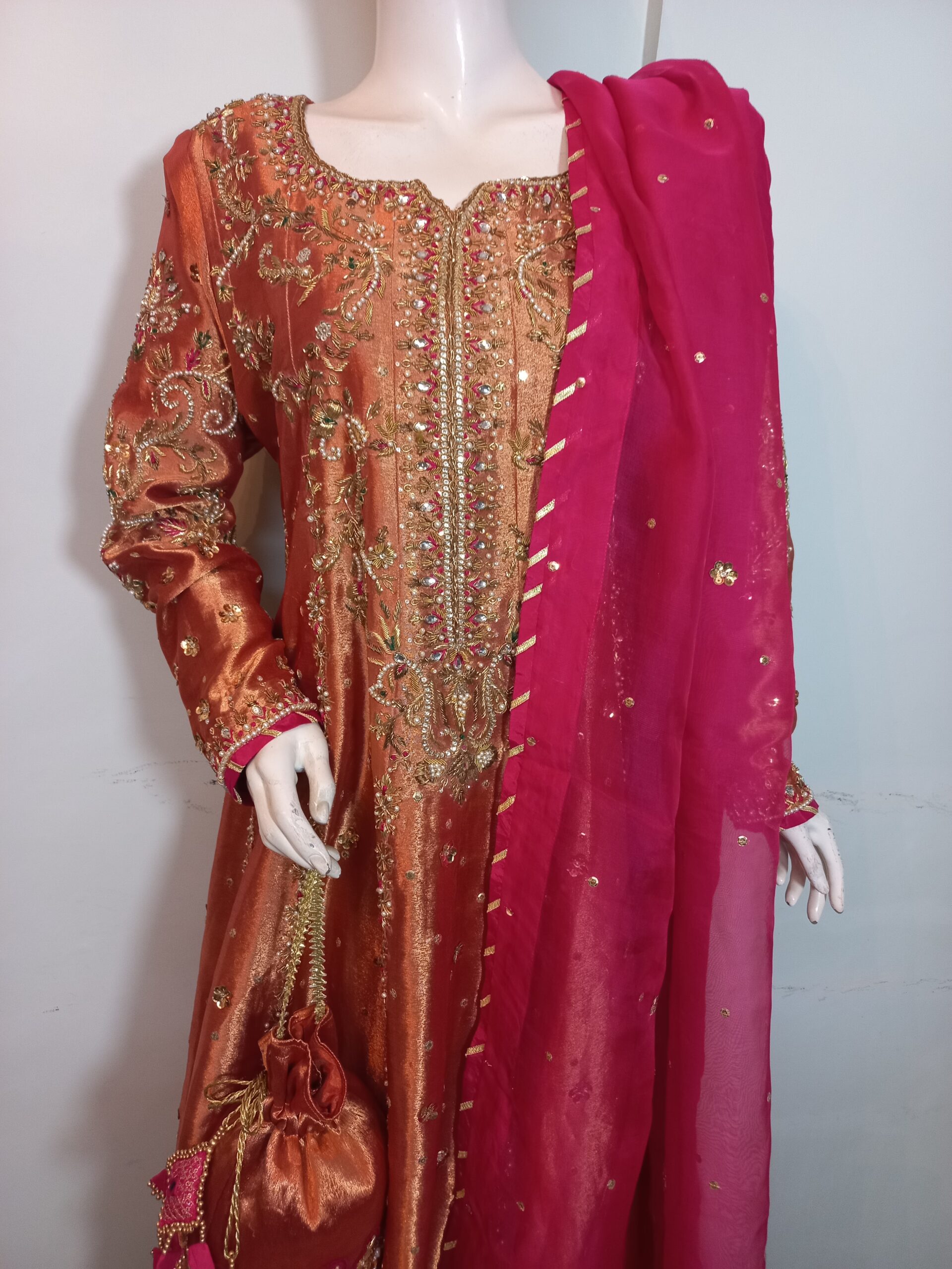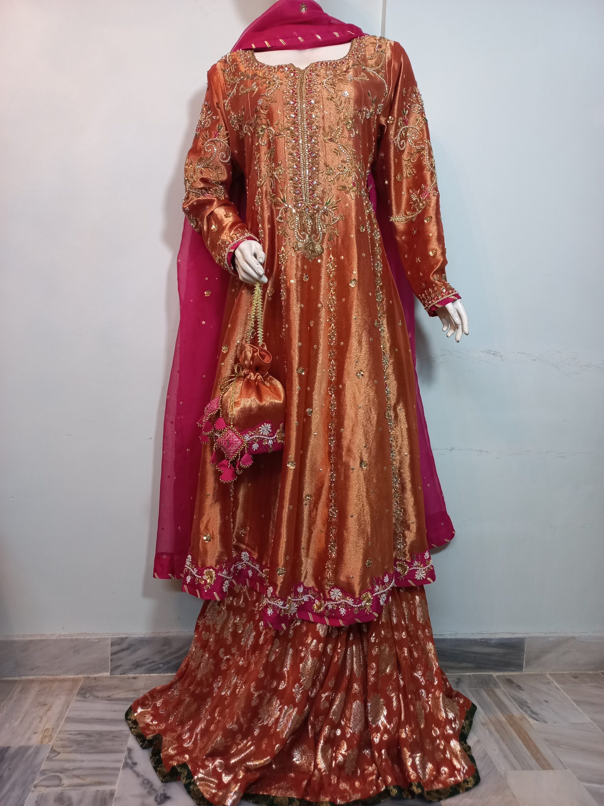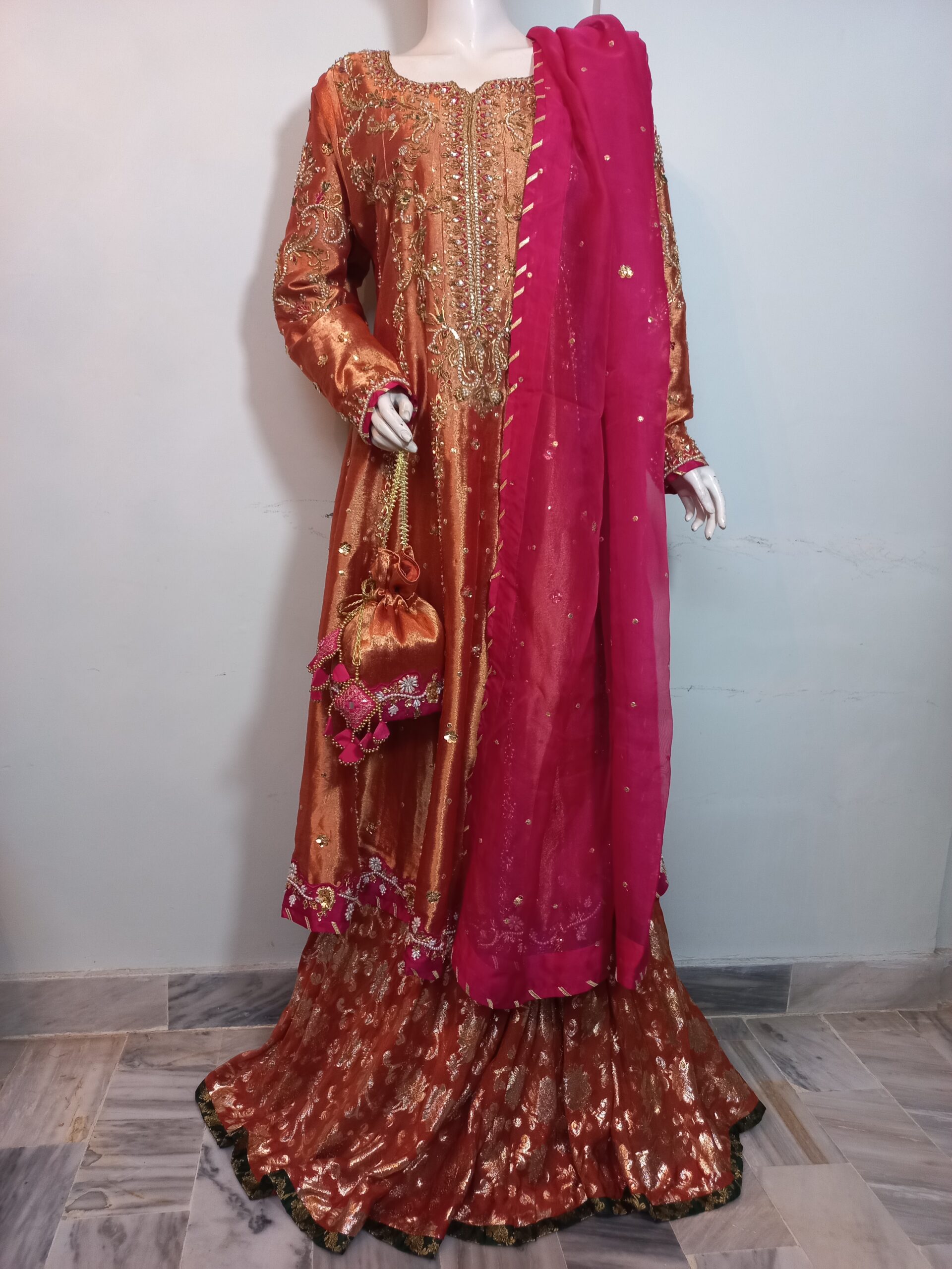 A mesmerizing kalidar frock in a radiant shade of orange, beautifully crafted on luxurious lame fabric. The neckline, sleeves, and daman are delicately embellished with handwork and enhanced with contrasting appliqué, adding depth and elegance. Paired with a regal jamawar gharara and a contrasting organza dupatta finished with four-sided gota borders, this ensemble exudes timeless grace and traditional charm—an ideal choice for weddings and festive occasions. The look is completed with a matching potli pouch, adding a charming and elegant detail.