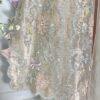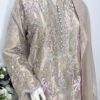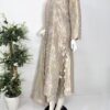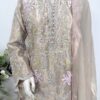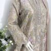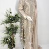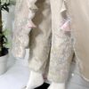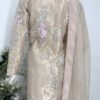 It is paired with a silk organza dupatta adorned with delicate motifs and an all-over sequin spray, finished with a contrasting tissue border. The look is completed with heavily embroidered Korean raw silk pants, making it perfect for festive and formal occasions.