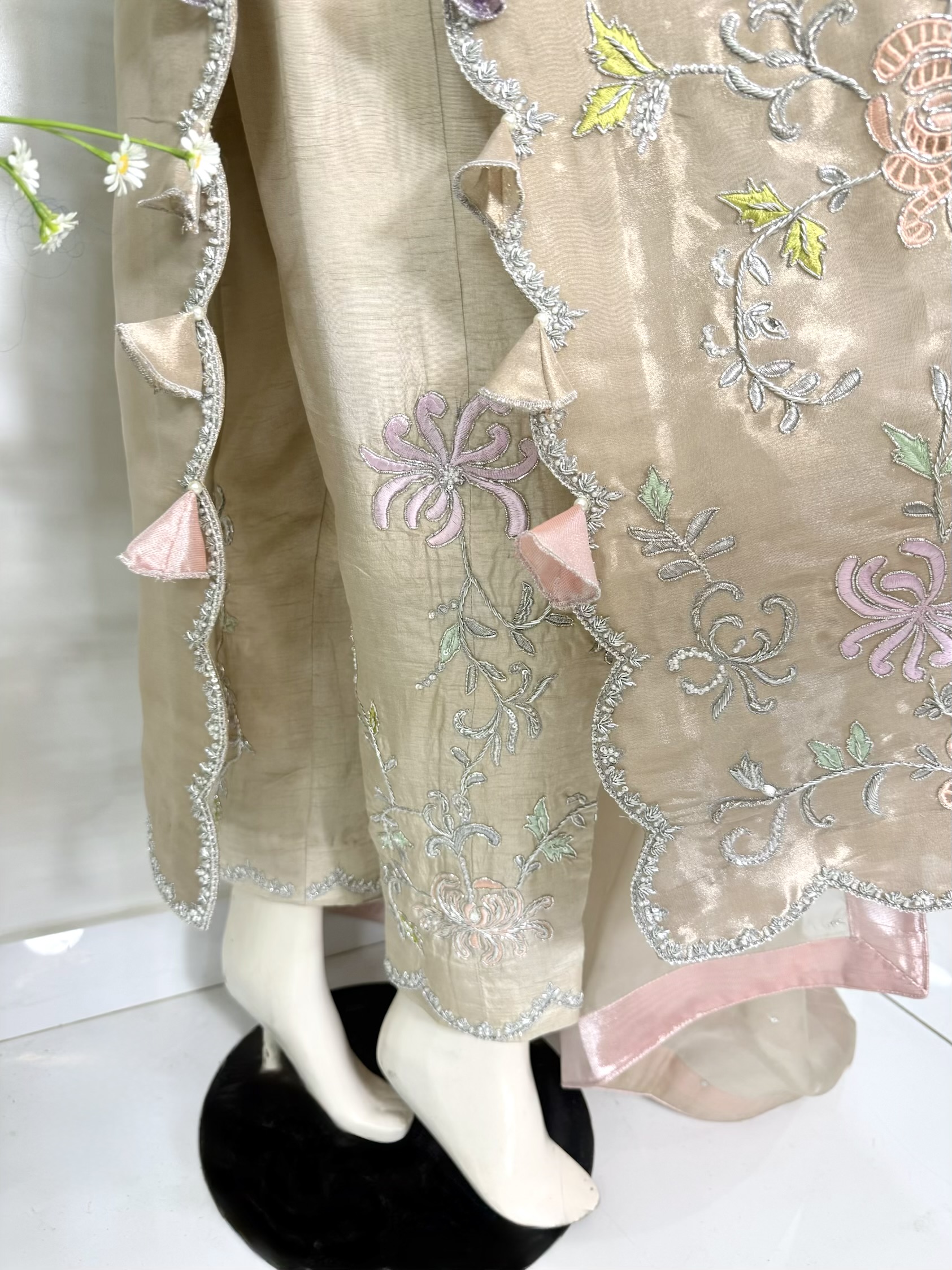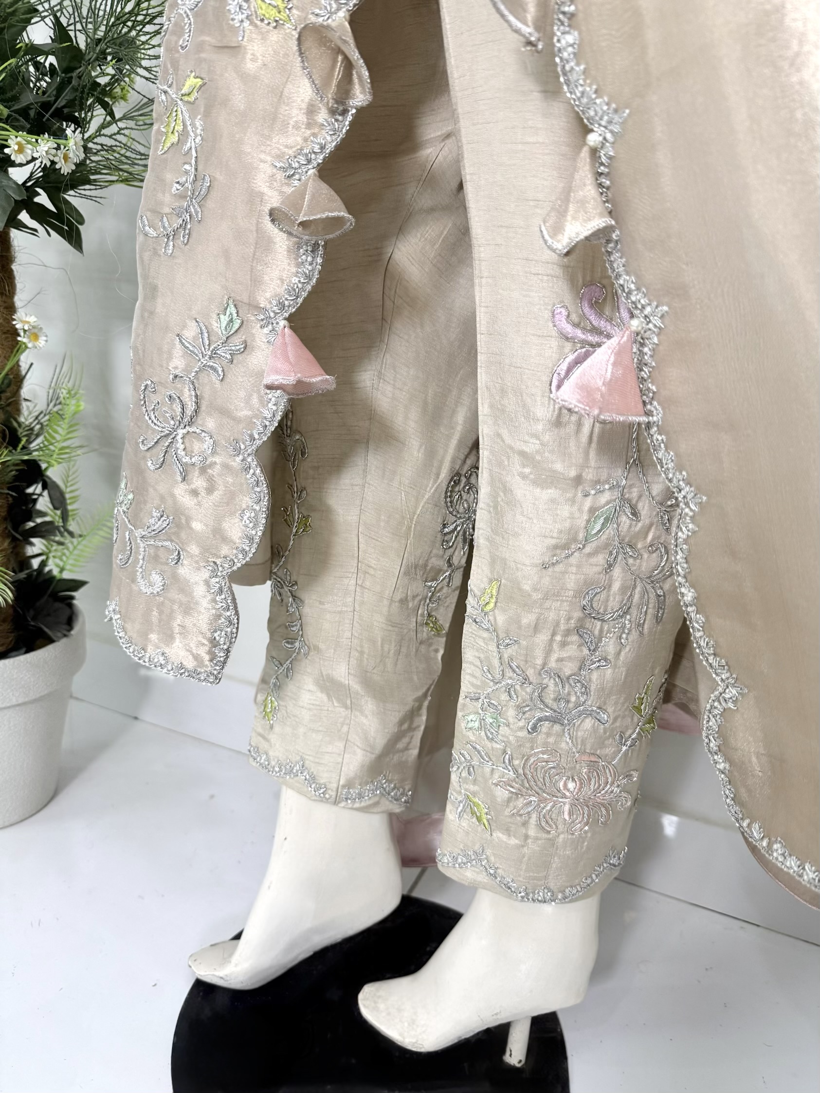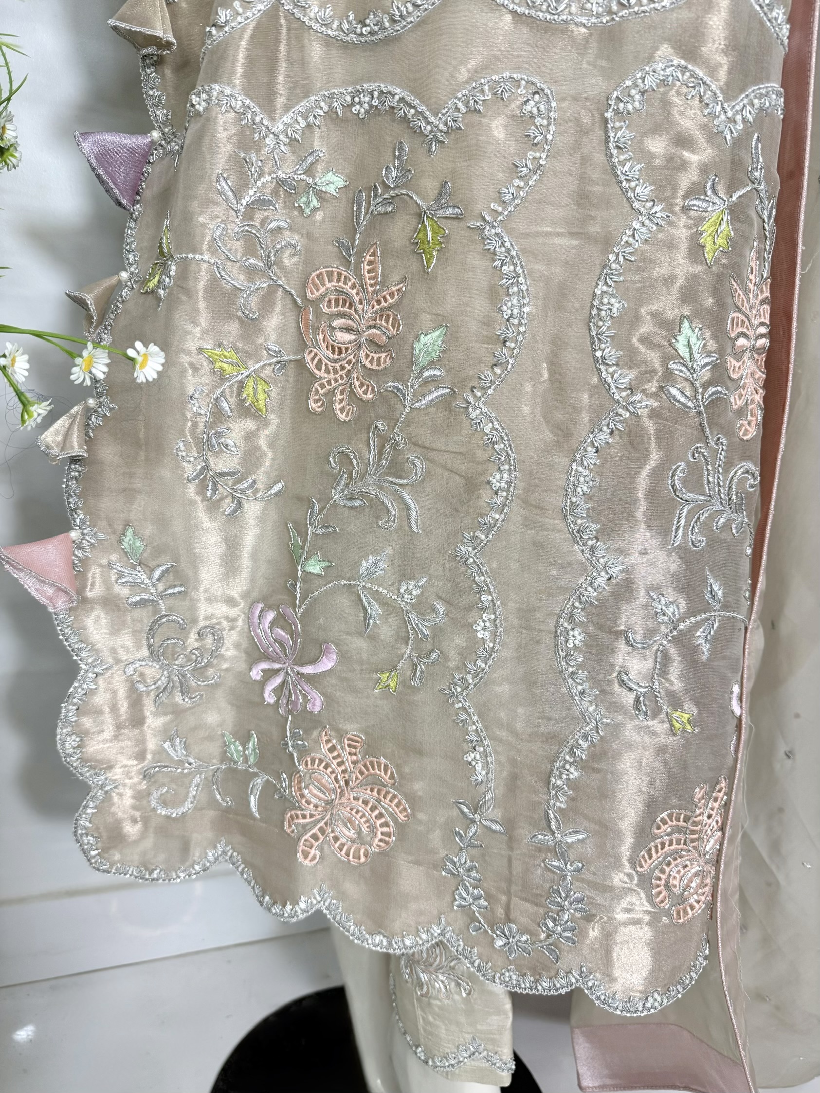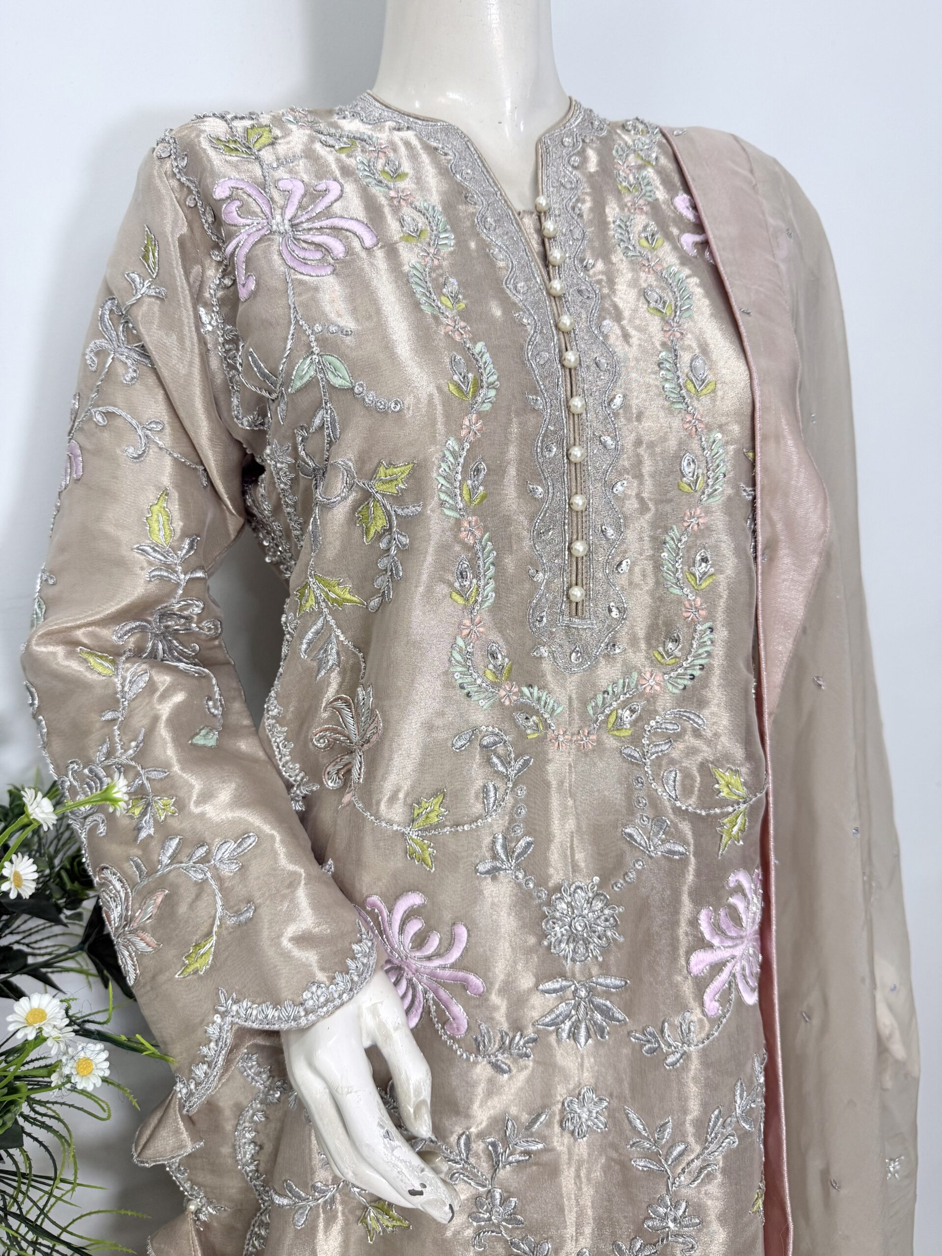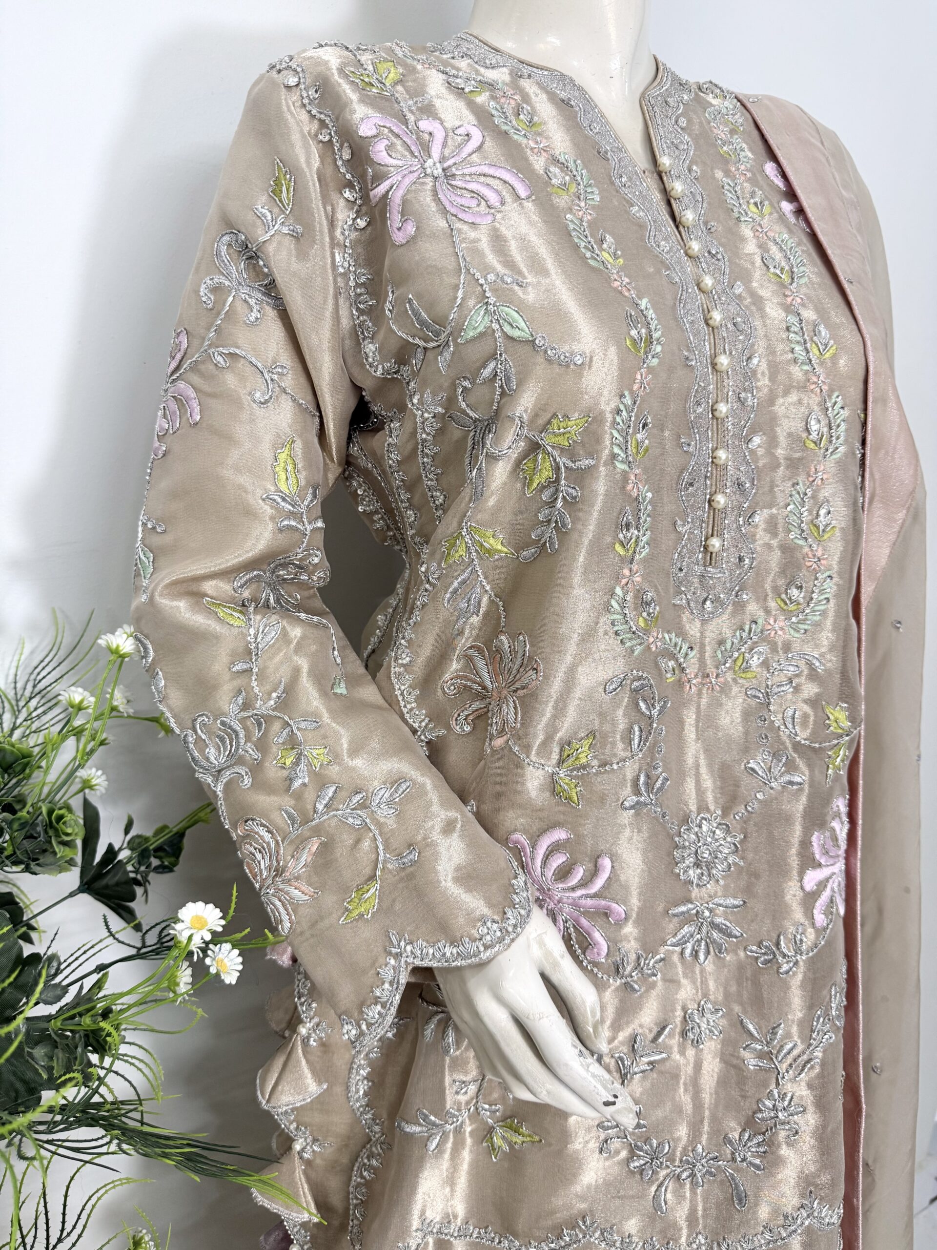 Crafted from pure lamé tissue silk, this shirt features heavy resham embroidery with elegant cutwork motifs, beautifully embellished with cora, dabka, sequins, Swarovski crystals, and pearls for a glamorous finish.