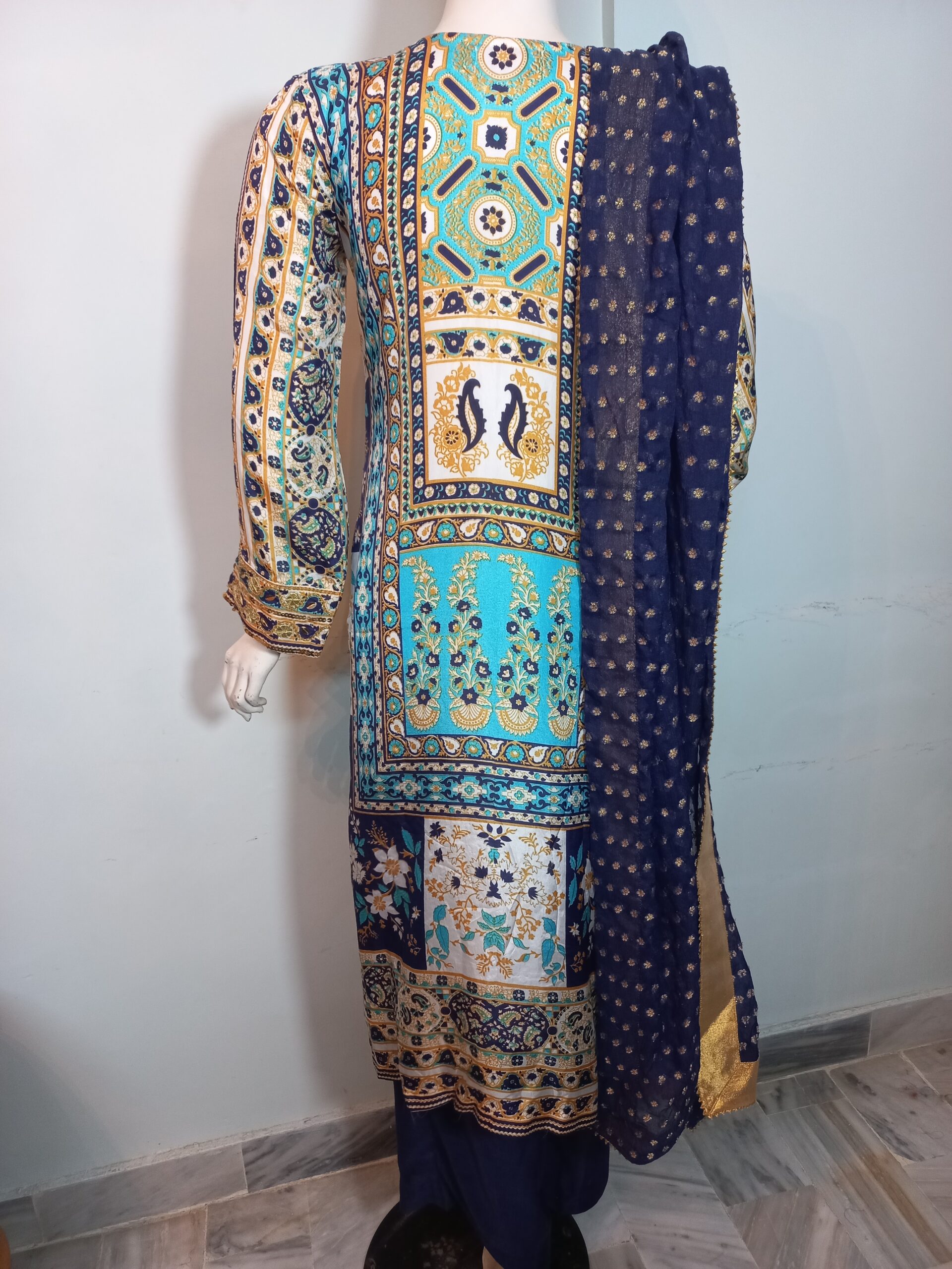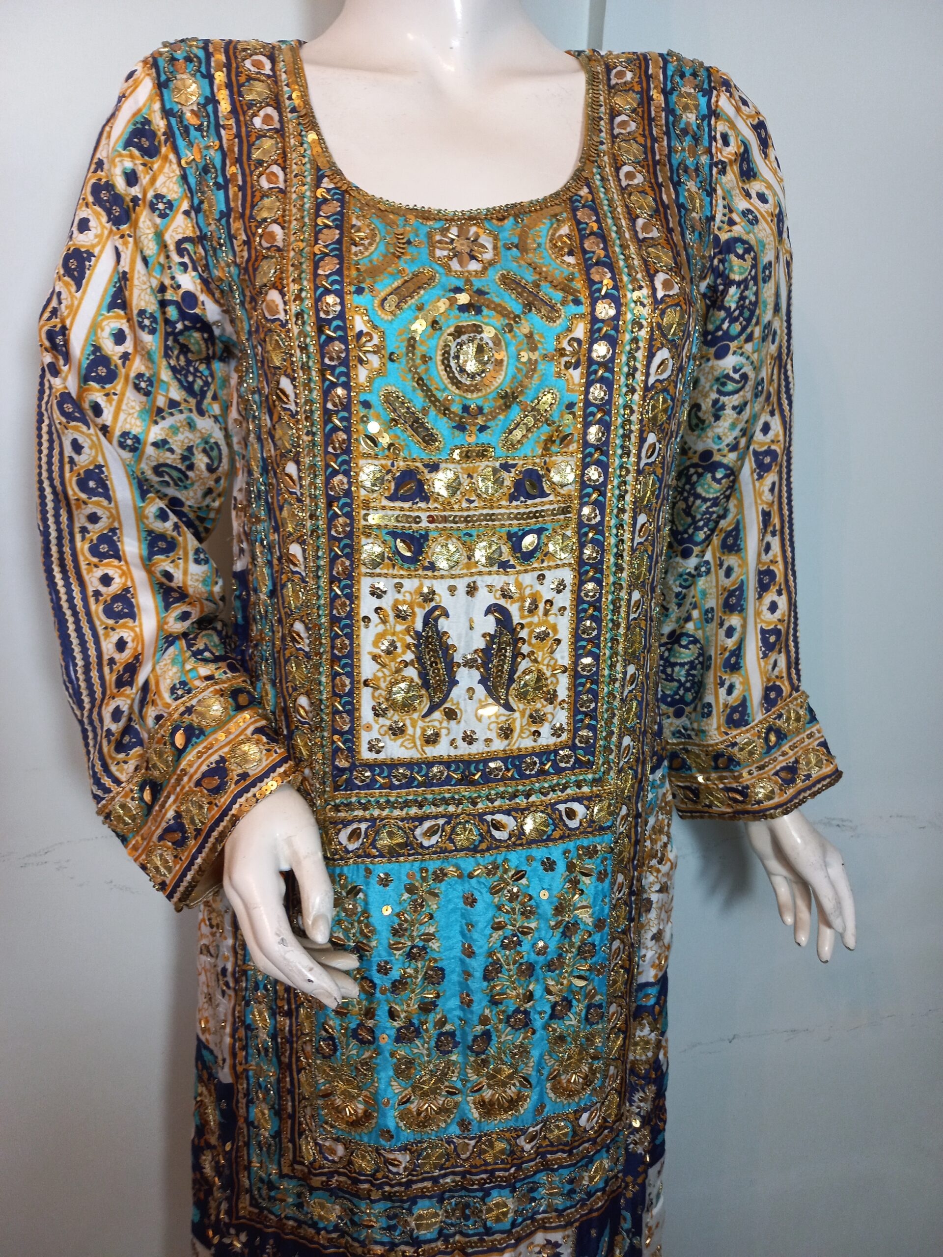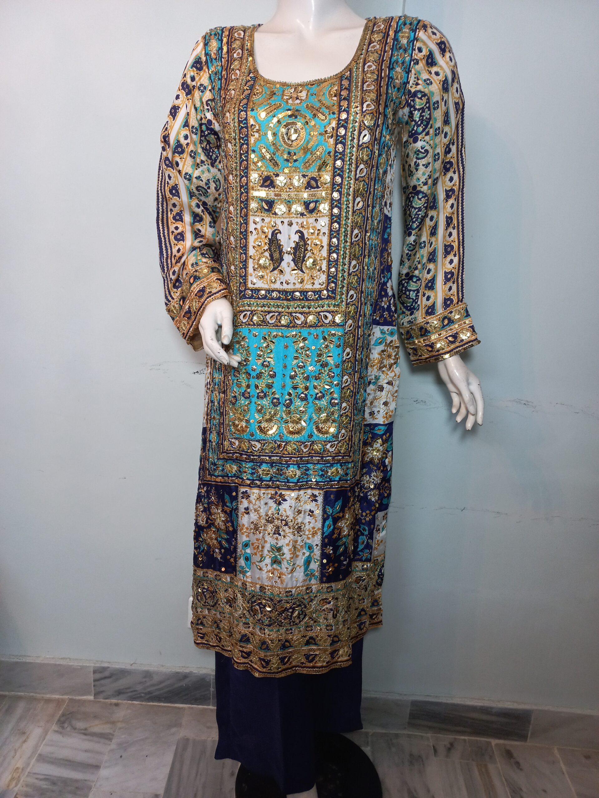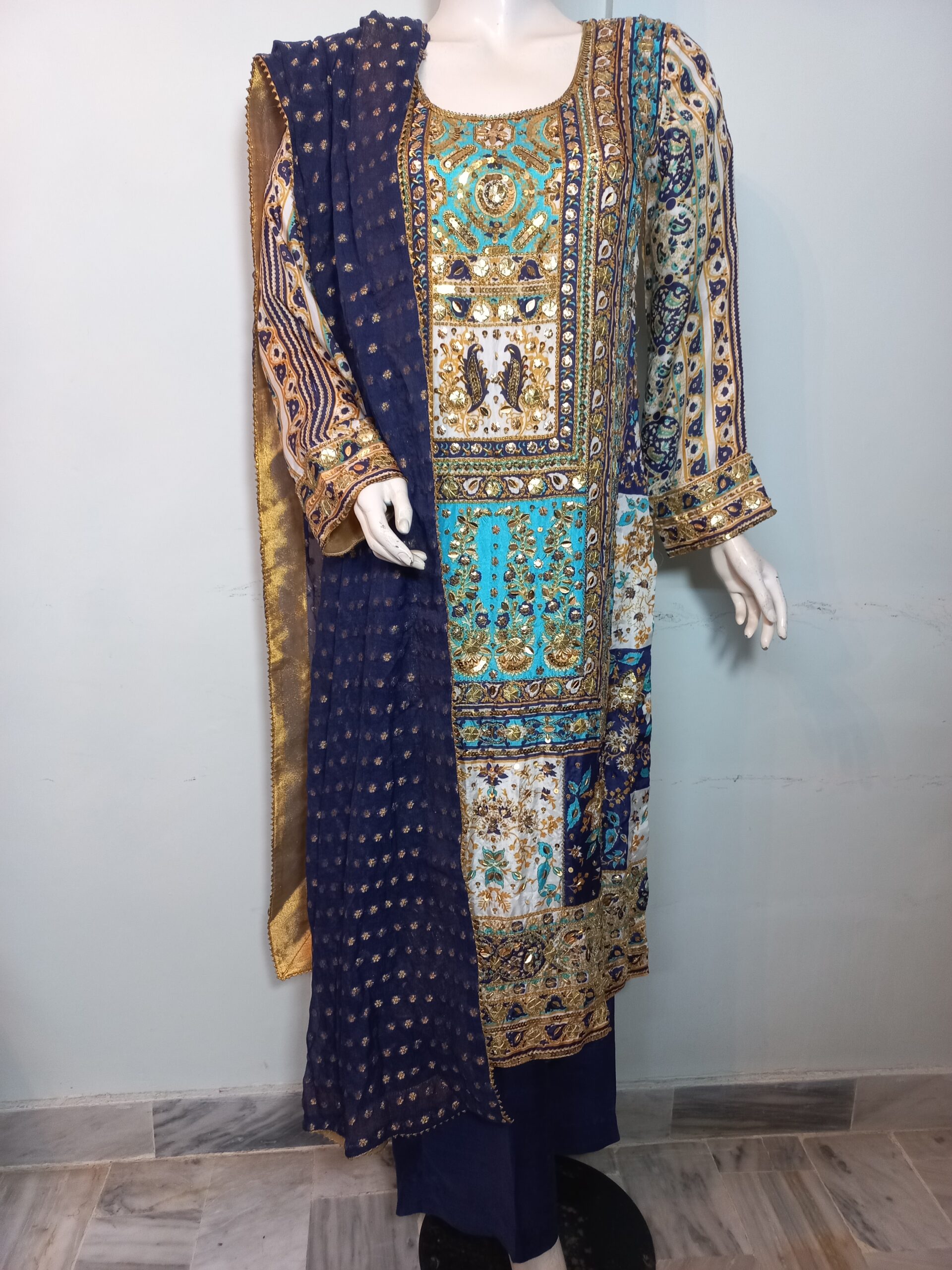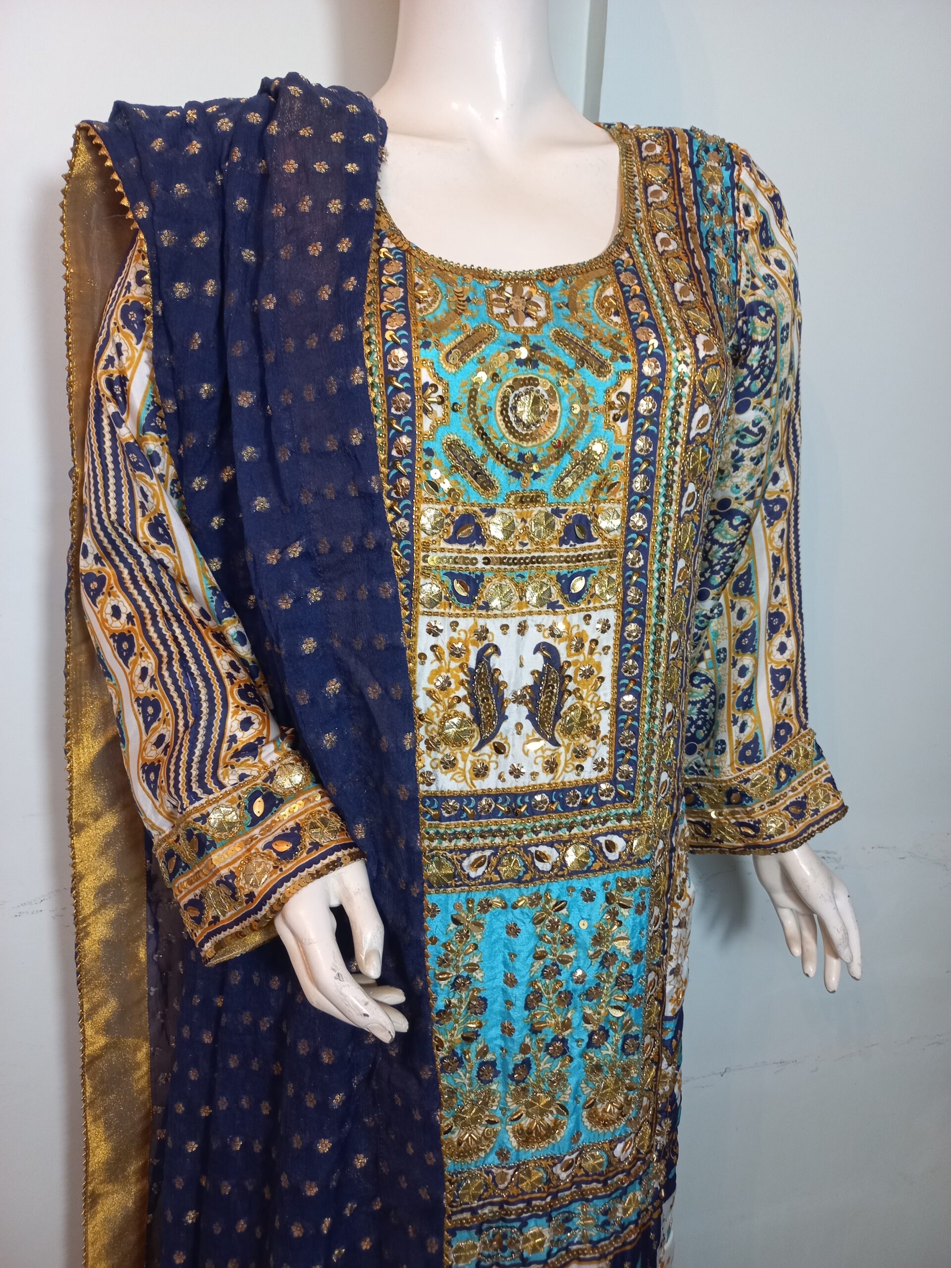 A vibrant printed shirt in lively, festive hues, beautifully enhanced with intricate handwork featuring gota, cora, and dabka. Paired with matching trousers and a dupatta finished with delicate detailing on all four sides, this ensemble is designed to perfection. A joyful and elegant choice for mehndi, mayoon, or dholki events, it captures the essence of celebration with traditional charm and modern flair.