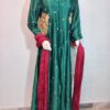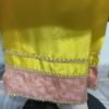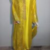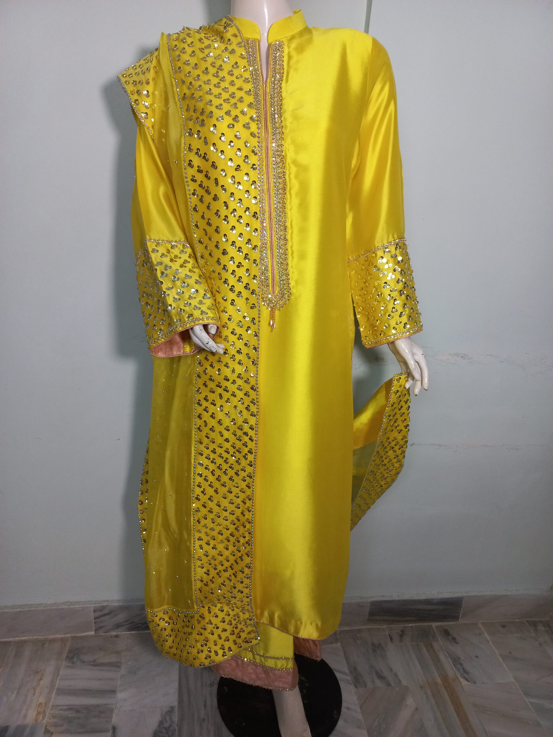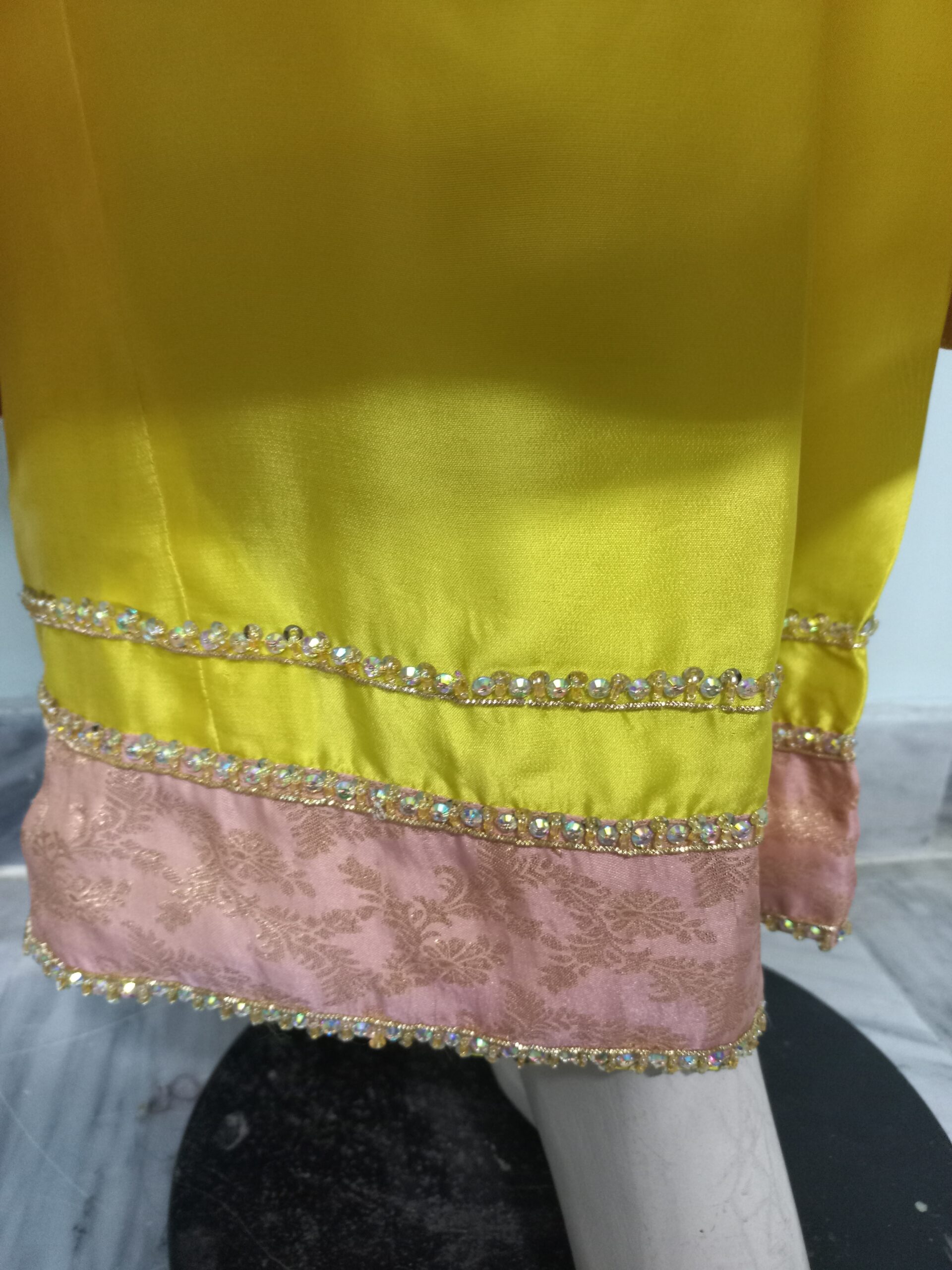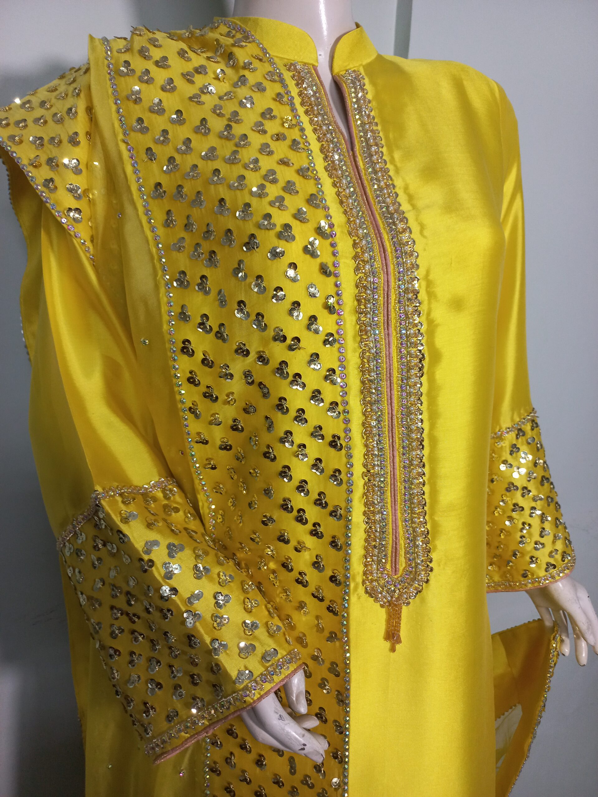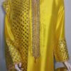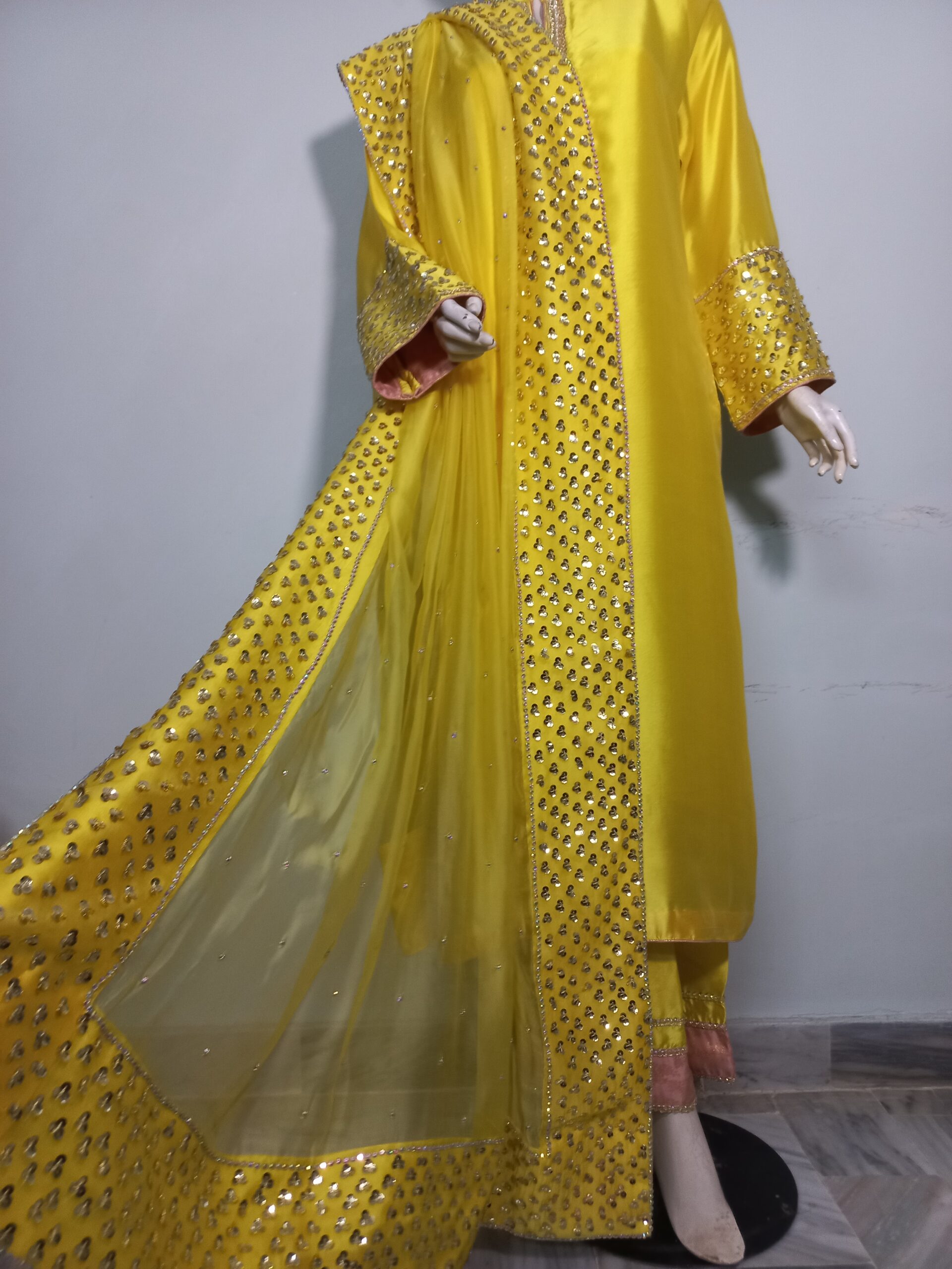 A glamorous long shirt, meticulously adorned with hand embellishments of sequins and stones along the neckline, creating a dazzling focal point. The neckline is further refined with delicate tea-pink piping, adding an elegant contrast. The look is elevated with a luxurious dupatta, featuring an intricately embellished border on all four sides and a graceful stone spray across the center. Completing the ensemble are matching trousers, finished with a tea-pink jamawar border at the hem, delicately embellished with stones for a sophisticated touch. Perfect for weddings, festive occasions, and formal gatherings, this outfit embodies timeless grace and opulence.