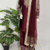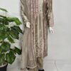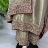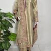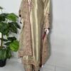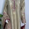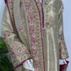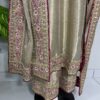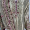 A rich and royal ensemble crafted on a luxurious zari tissue silk canvas, featuring exquisite tilla embroidery enhanced with intricate hand embellishments on the shirt, trousers, and all four sides of the dupatta. The outfit is elevated with hot pink jamawar piping, adding a striking contrast and an extra touch of opulence.